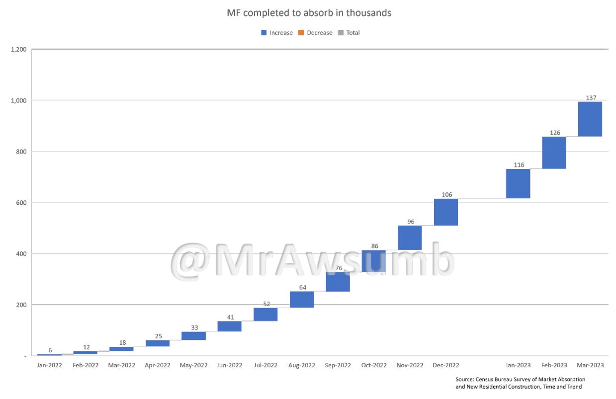 I took the same data regarding completions, but this time used Census Bureau SOMA (survey on market absorption for Multifamily Apartments) and we get the following inventory build in multifamily.