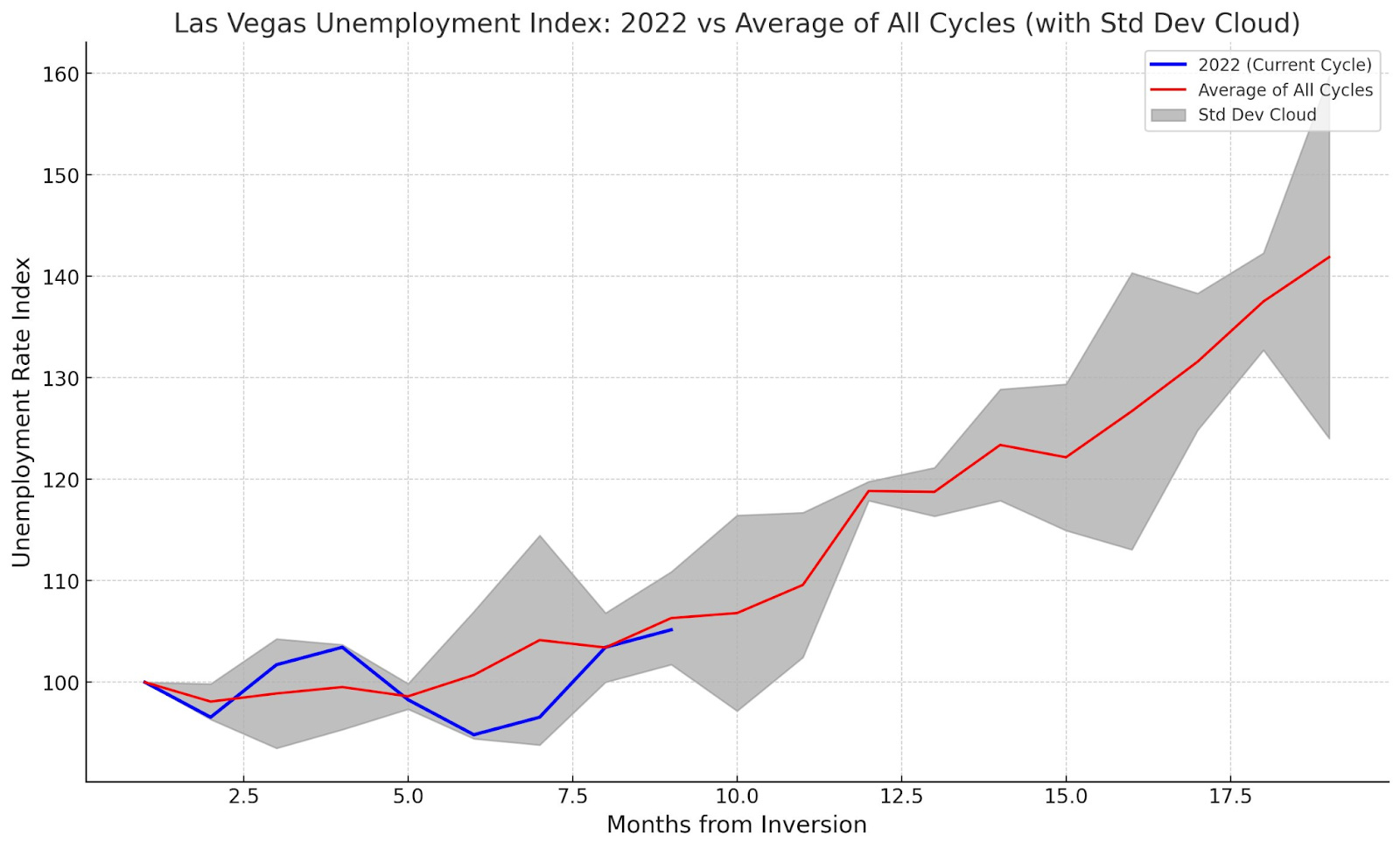 In the graph you can see the current unemployment index (looking at monthly unemployment number) relative to the average of previous economic cycles given in the Vegas MSA data. We are currently trending up (slowly) for unemployment but right within the standard deviation of past cycles. The next 4-6 months are going to paint a very clear picture for us in Vegas about what we can expect on the unemployment front and especially on when we can expect to see job creation roll over and become ‘job destruction’.