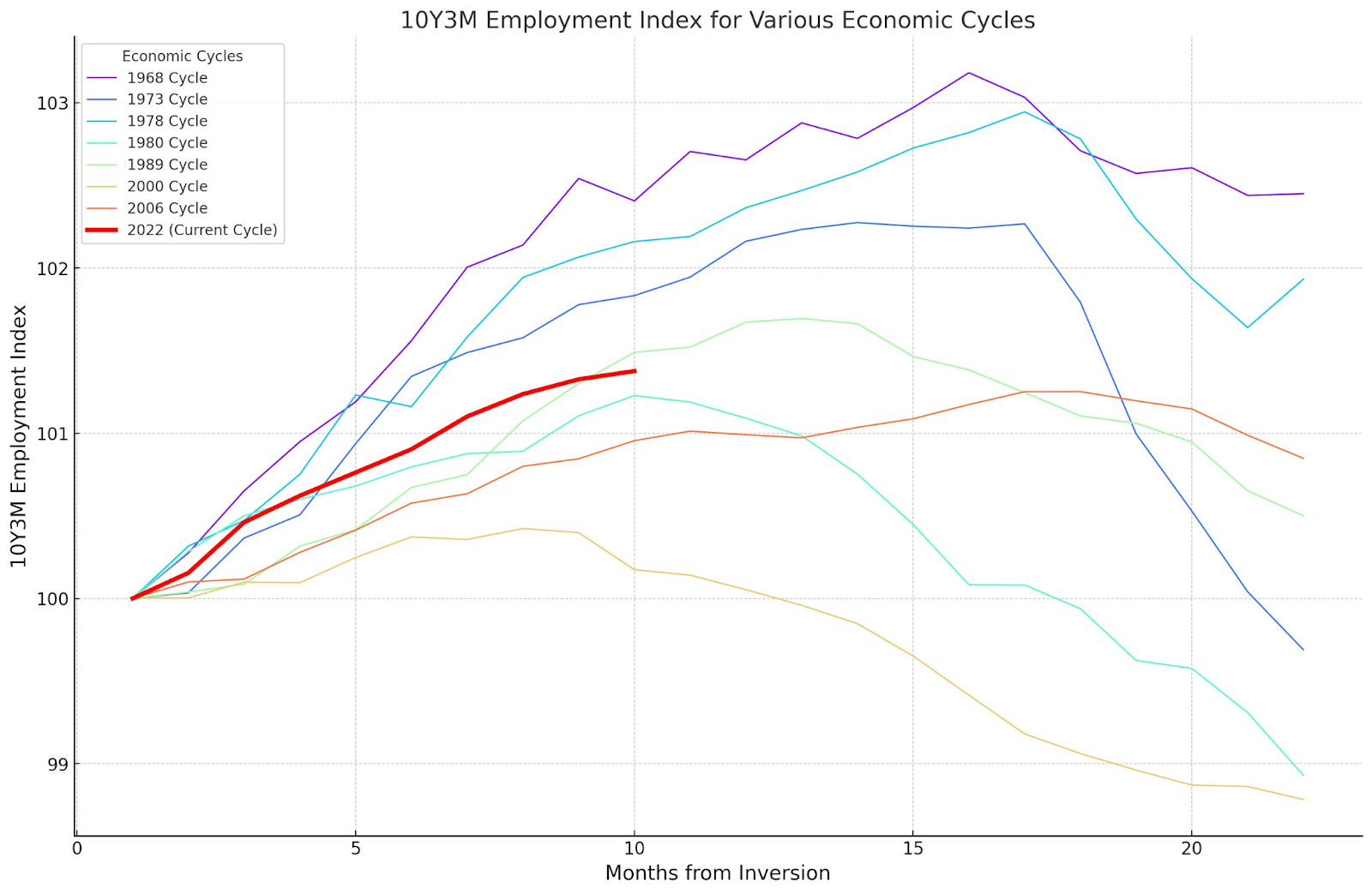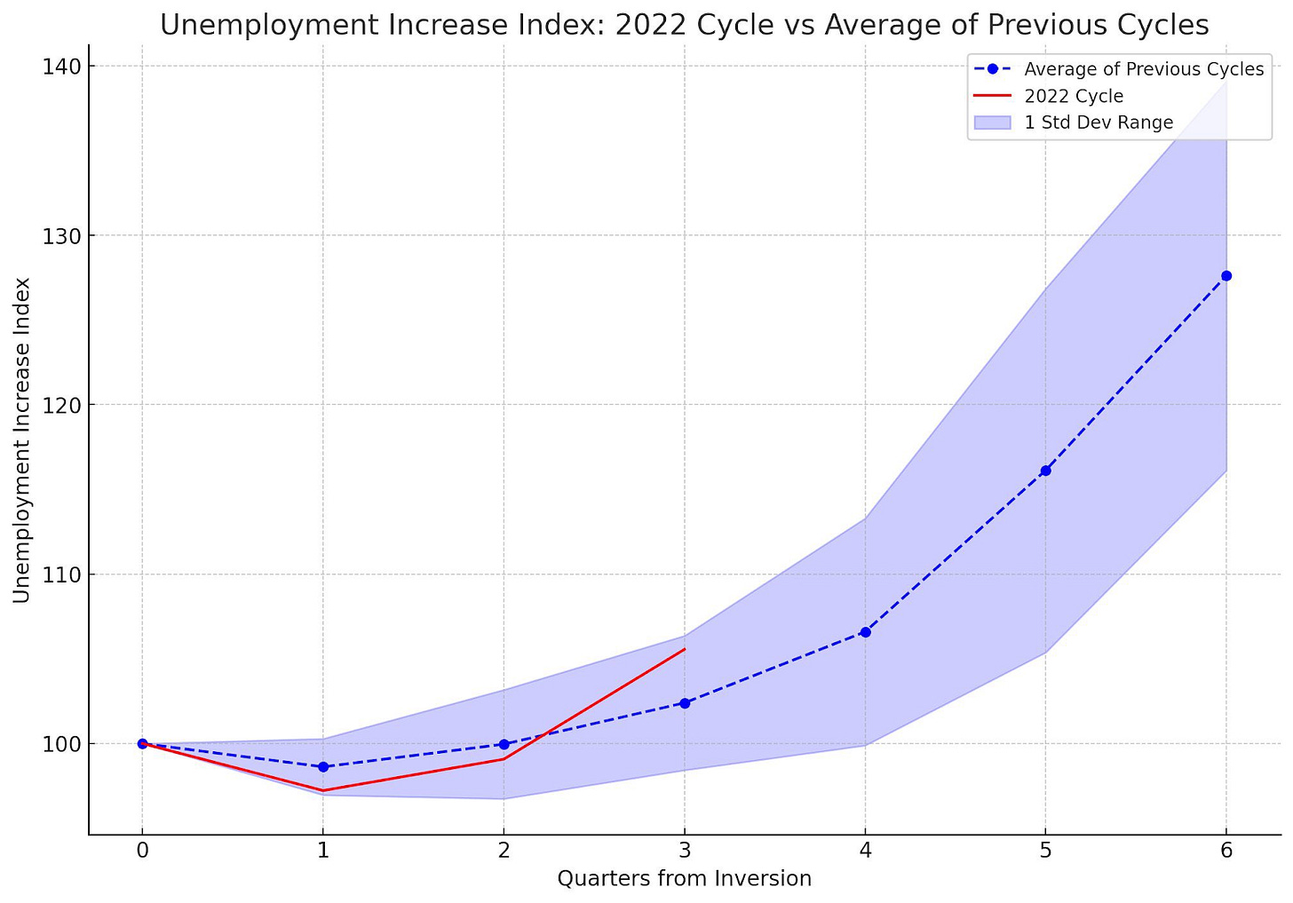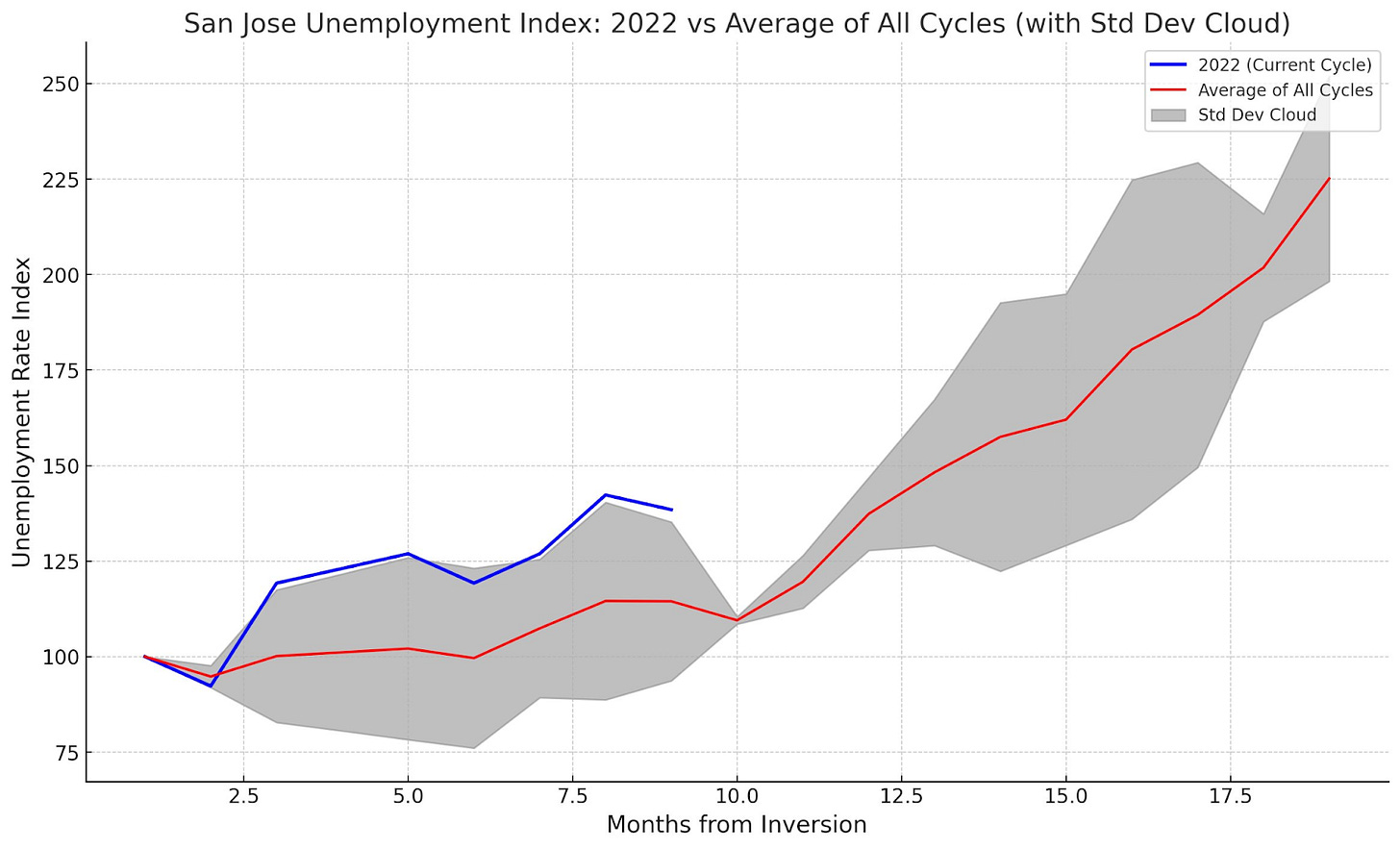 We can see that San Jose’s current unemployment rate index is tracking fairly in line with previous cycles and actually a bit above the average standard deviation for the plotted cycles.