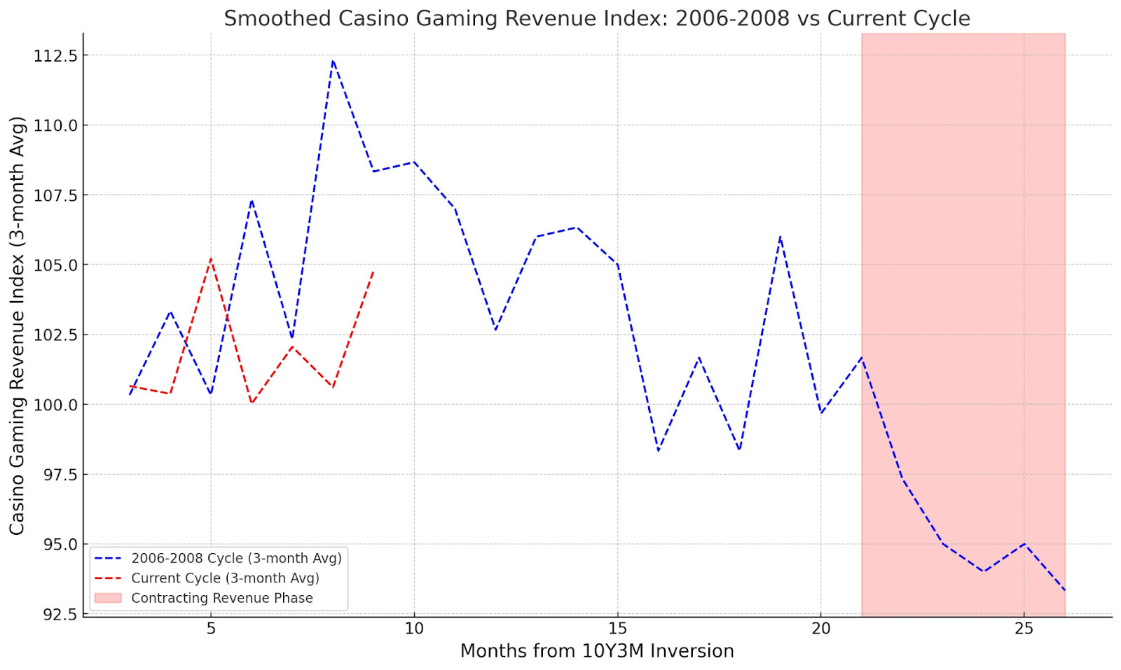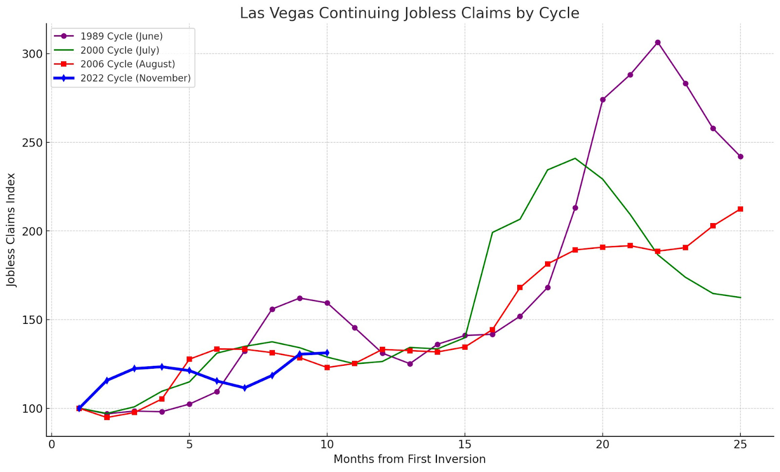 Another hot topic for Vegas continues to be record-breaking gaming revenues. I think this warrants caution as having any bearing on the actual health of the larger economy. More Americans are desperate to hit and big and escape their difficult lives so they take it to Vegas to either lose big or win small (and of course - you have a few dozen that live to tell stories about their new retirement plan). The graph I generated utilized a smoothing function using the 3 month moving average in order to plot revenue by both the 2006-2008 period and the present cycle. As you can see - we are trending up into the winter (that happened in 2006 as you can see on the chart as well) - and it really wasn’t until month 21 following inversion that unemployment and a bad economy we’re at the forefront of people’s minds and Vegas gaming revenue began contracting. I am anticipating a few more strong months for Vegas into the holidays, Formula 1, and potentially even the New Year - although things may look quite different in Sin City for all the sinners next year.