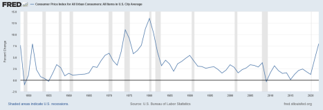 This chart is the rate of change of those two items. What we’re looking at, is the ongoing battle between the rate of increases of subsidies, and the FF effective rate. These subsidies come in every form. In fact this chart doesn’t even take into account state/municipal subsidies and tax benefits. For every subsidy rate increase, there’s a corresponding federal funds effective rate increase, to curtail the “bubbly” effects of irrational exuberance, a tool to prevent the potential hyperinflationary pressures they set off. See the CPI to correlate: