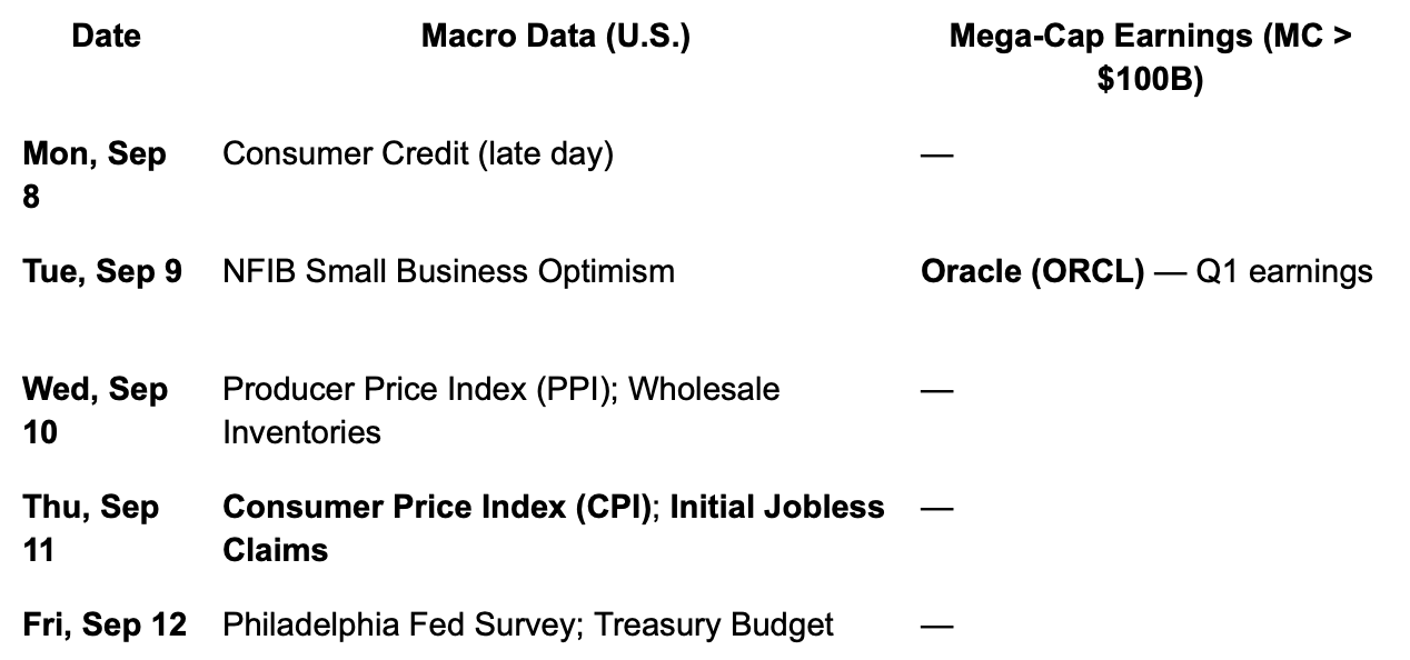 This week puts the inflation focus back into view with CPI/PPI and the Philly Fed Prices Paid Index. Only Oracle this week from a megacap standpoint.