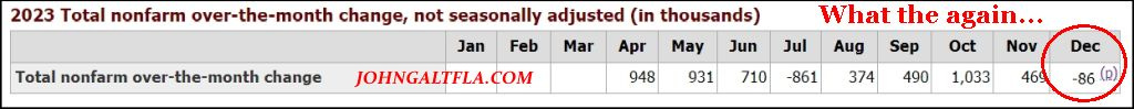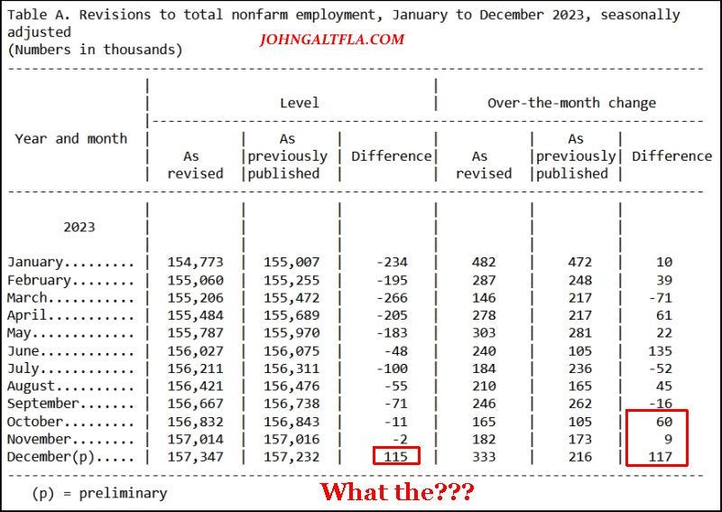 So if we added 115,000 new jobs over the original published numbers but the Birth Death model indicated a loss of 86,000 jobs, then this means that the real number of “new” jobs created was over 200,000 jobs. Which makes the numbers in December 2023 and January 2024 even more unbelievable.