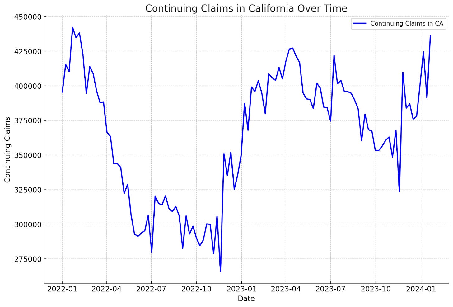 Continuing claims are the highest since January 2022 at >430,000 and made a higher high this year even with all of the tech layoffs California experienced in 2023.