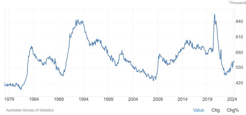 Australia published its latest employment data this week. Job growth remained positive - particularly on the full-time side of the equation - but unemployment and total unemployed Australians - increased. This backs the narrative we’re seeing form more broadly in developing nations of unemployment starting to increase with labor markets being impacted by the monetary policy lag of large central bank policy increasing from 22 and 23.