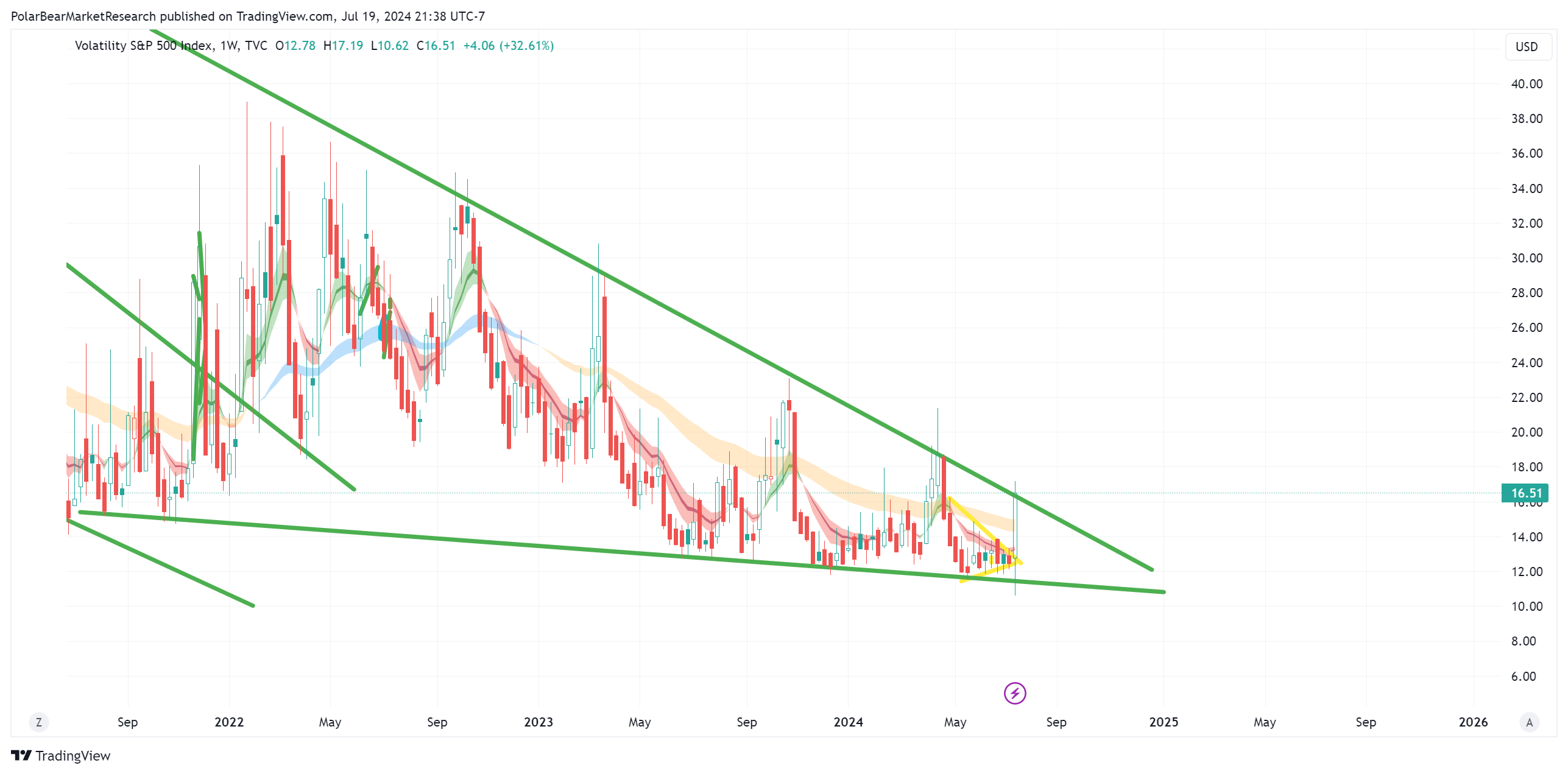 VIX was on the edge on Friday, but not confirming the shift in volatility we’re looking for (weekly graph depicted). As we discussed last evening, that larger shift will likely occur after the Fed shifts its policy stance and focuses on the employment mandate over the inflation mandate.
