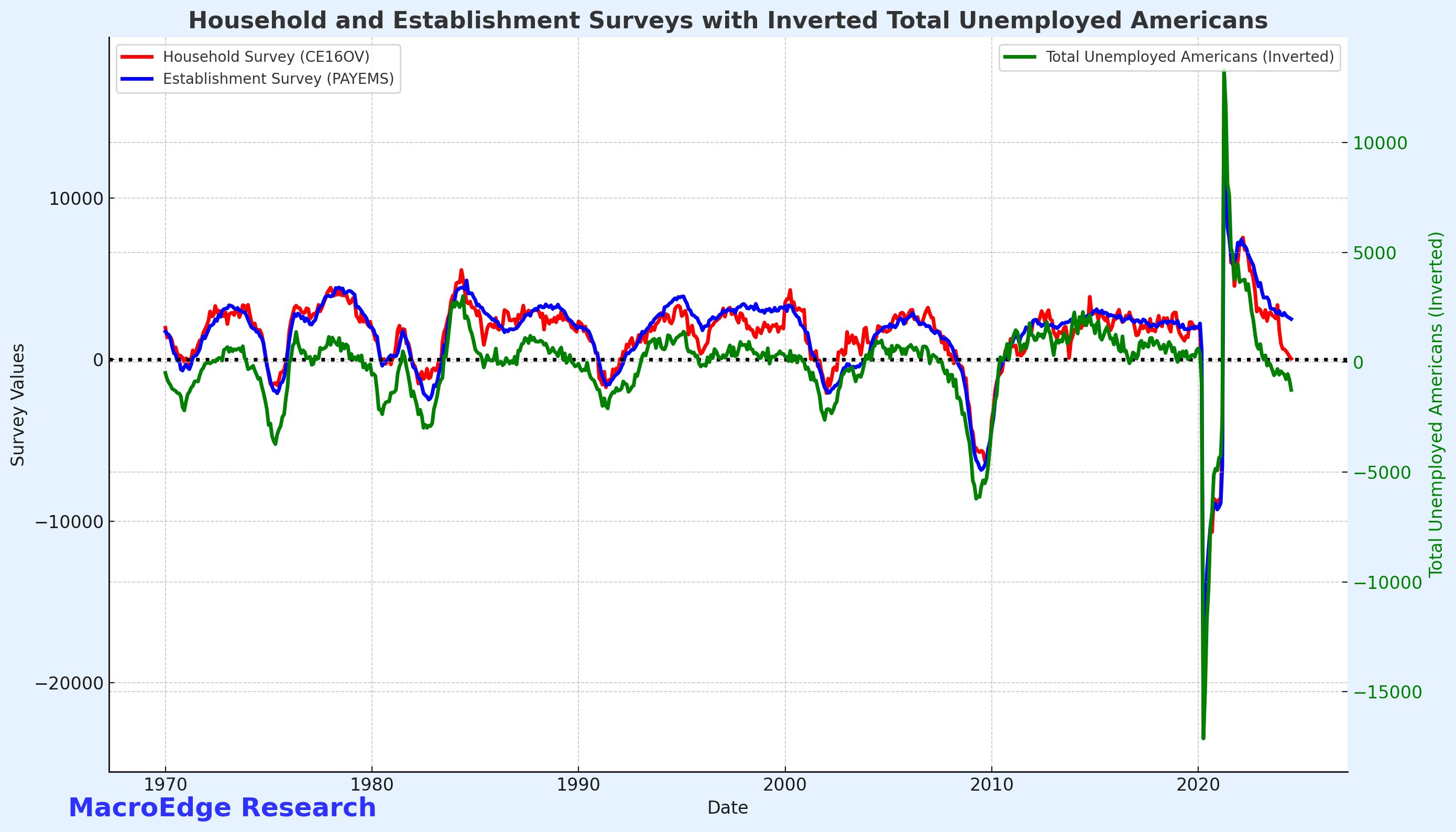 We think the tailwinds are leaving the sails from the non-cyclical sectors now too, which means slower payroll growth in the months to come (establishment headline), and a continued trend in the cooling of the numbers in the Household survey (which peaked in November 2023). We’ve already discussed our thoughts on the asinine 818,000 revision from the BLS (which they released late) and why that represents a larger issue for labor market data tracking in an era where the market reacts to the first headline and no one believes anything. The worst case scenario and largest scenario out of their control would be one where they lose control of both the labor market and financial markets - one that isn’t too far off where we are now. (As mentioned above, you don’t need contracting payrolls to be in a recession as evidenced in 1974). From the economic perspective - our base case remains a prolonged economic and labor cycle with the Fed having more limited firepower than in previous instances like 2020 due to recency concern about inflation and the risk of creating a ‘lost decade’ scenario in the context of a spiraling fiscal environment and global economic weakness.