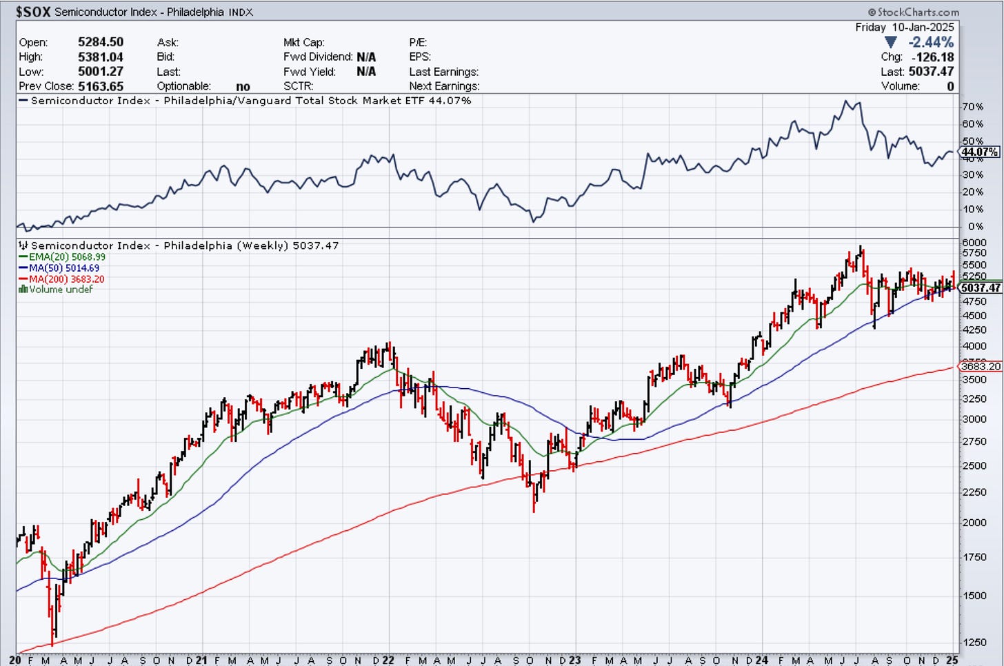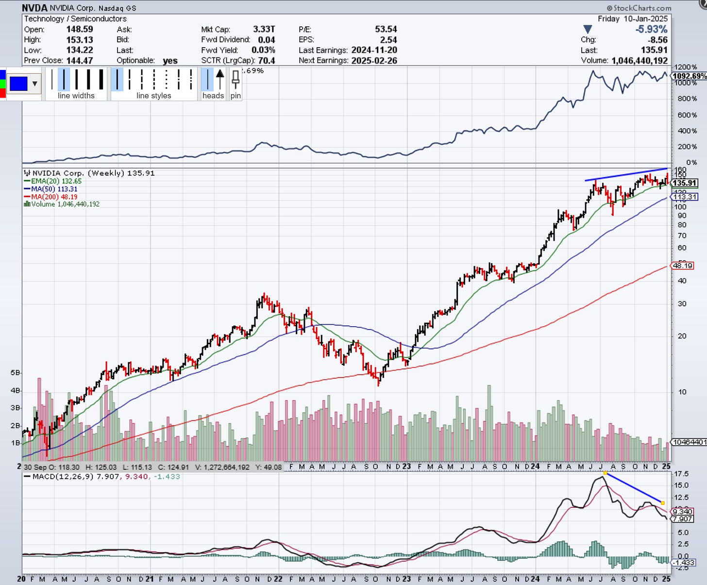 …Jumping into the macro. The real point of this note outside of delivering a note is discussing the what of what’s going on to kick off the 2025 year in markets. Thus far, it’s been a rocky start to 2025. The Nasdaq (and semiconductors in particular, which I’ve harped about since August) - gave up the last 6 months of gains again, pushing them back to July 2024 levels.