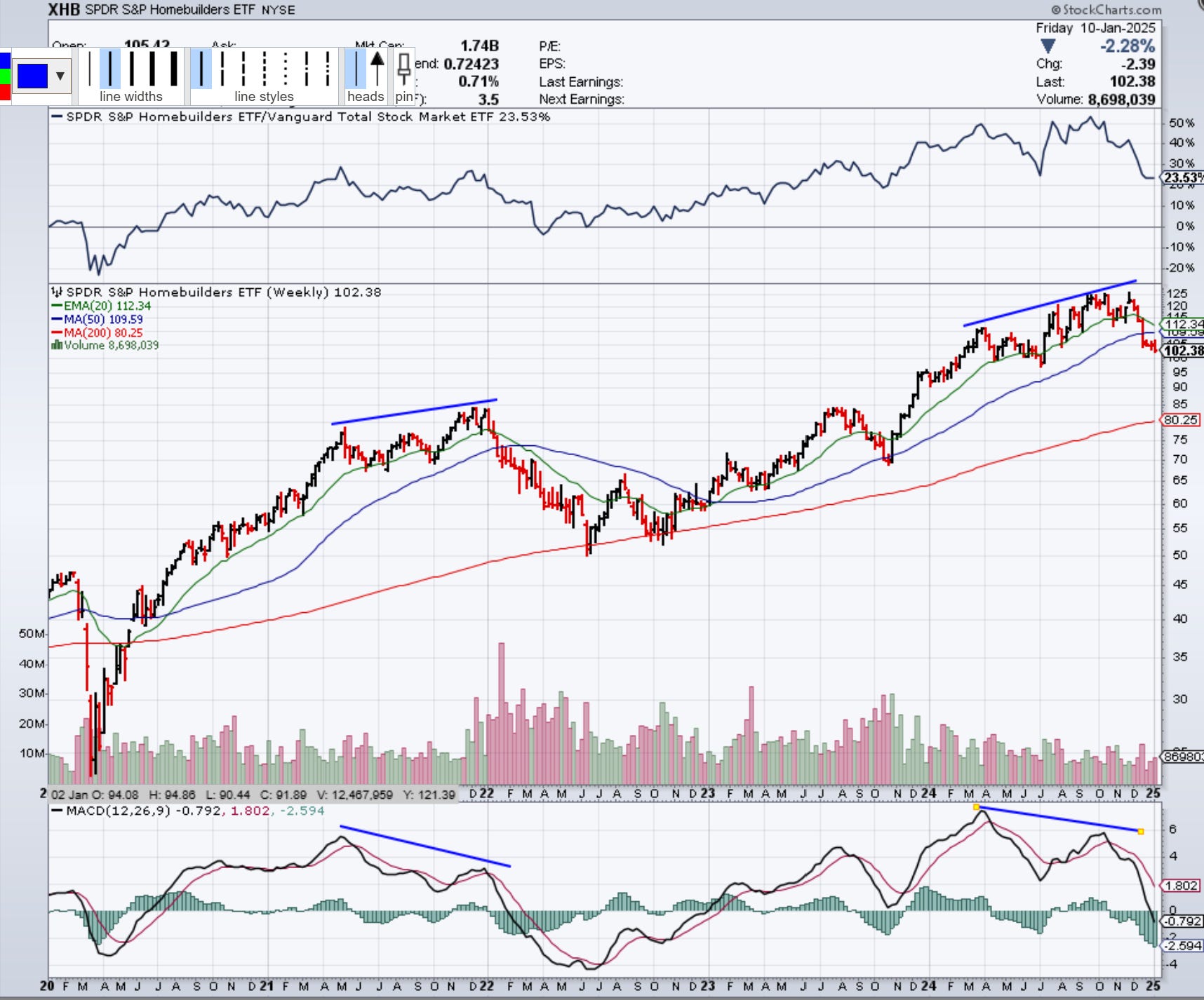 Housing is following a similar setup that let to a year of decline in 2022, with a weekly bearish divergence confirmation and breakdown. More follow-through needed, but speaking to the impact of higher for longer on this particular sector./