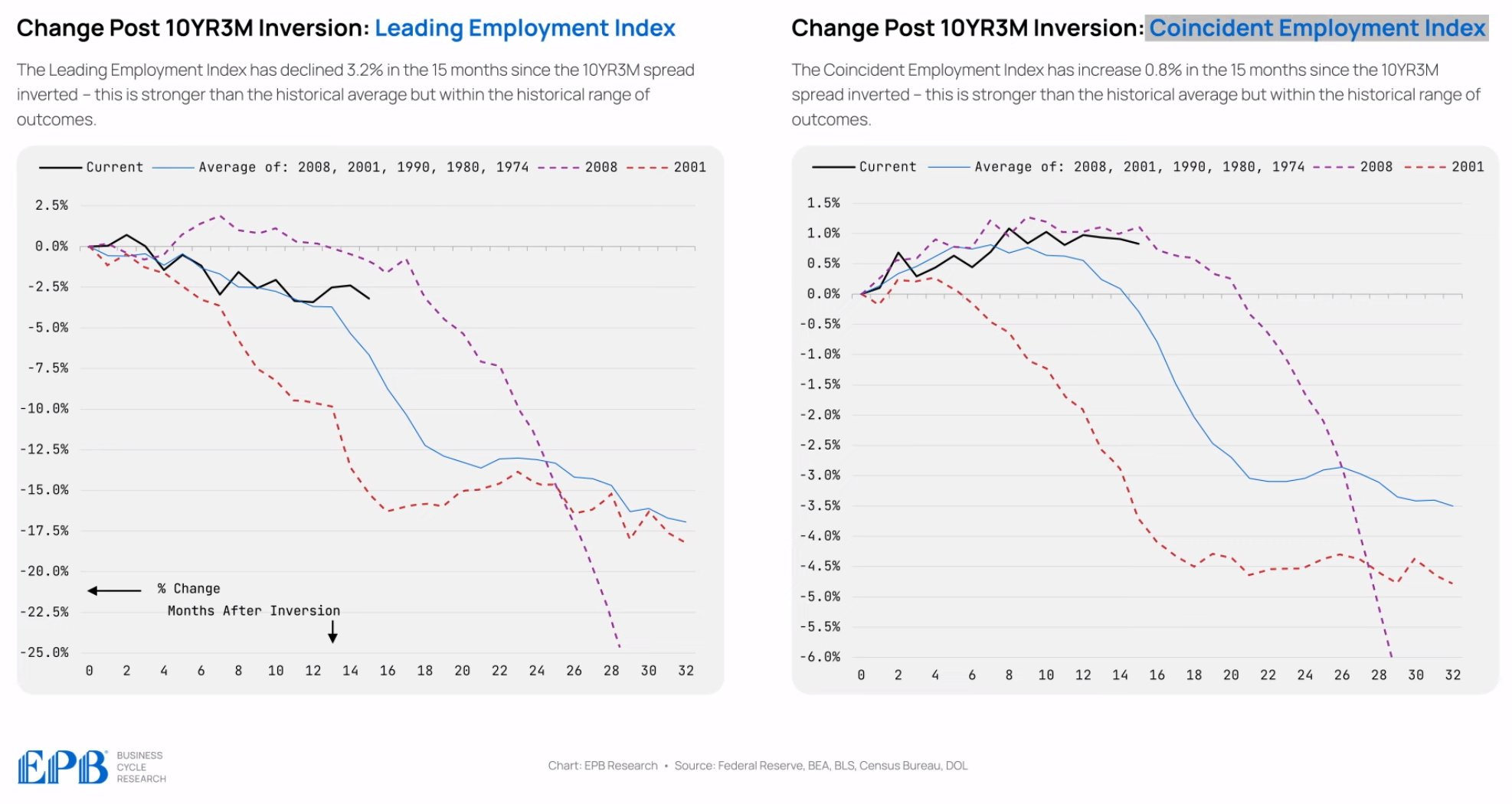 Claims are low - yes, unemployment is still low at 3.9% (U3) - quite low, yes, but rising, U6 - rising, and as I highlighted this week (along with our Unemployment Index post 10Y3M inversion) - the largest increases in unemployment follow the Fed unwinding high rates which means at maximum employment that the largest risks are ahead for labor, not behind us: