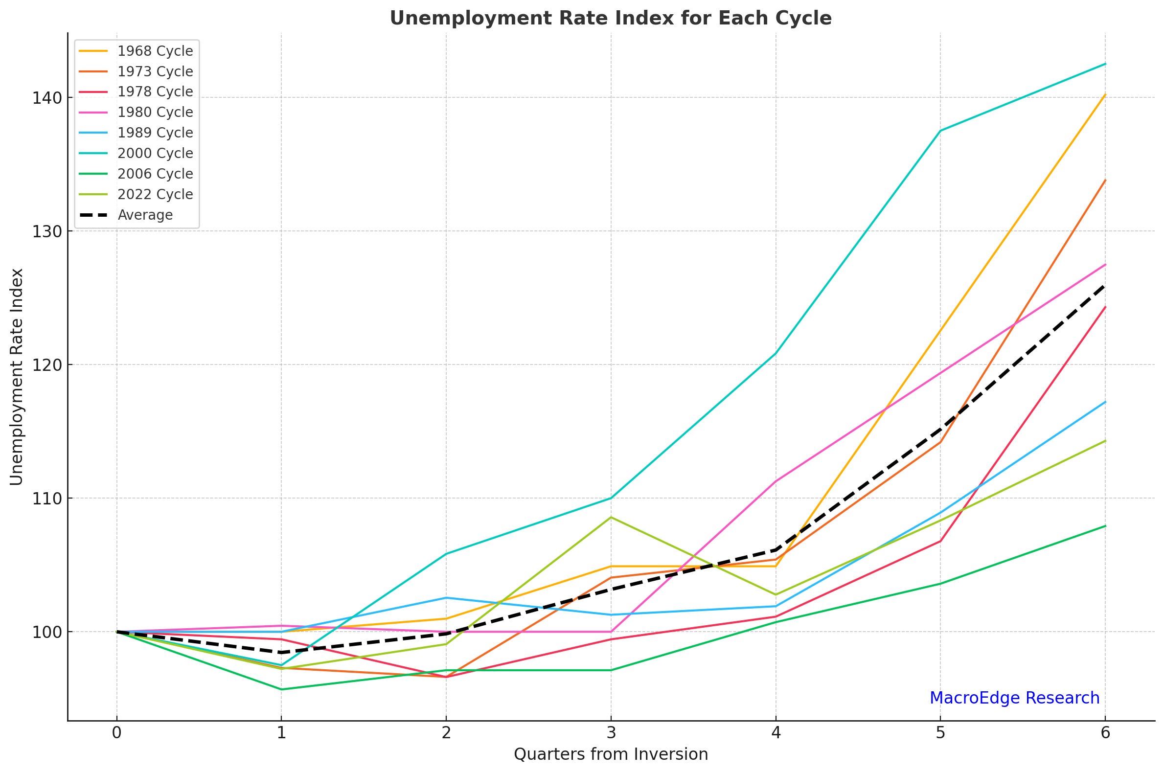 (Above) In the current cycle, unemployment has increased to 4%, historically low in the dataseries but unemployment generally starts low prior to labor market rollovers (see every cycle since 1969 excluding 1981). The current cycle and the immense lag in the labor data looks most similar to the 1989 and 2006 cycles as seen below in our unemployment rate index. Unemployment tends to increase from anywhere to 12-36 months following the first rate cut and you can view each tightening cycle (including soft landings) on MacroEdge.net/data