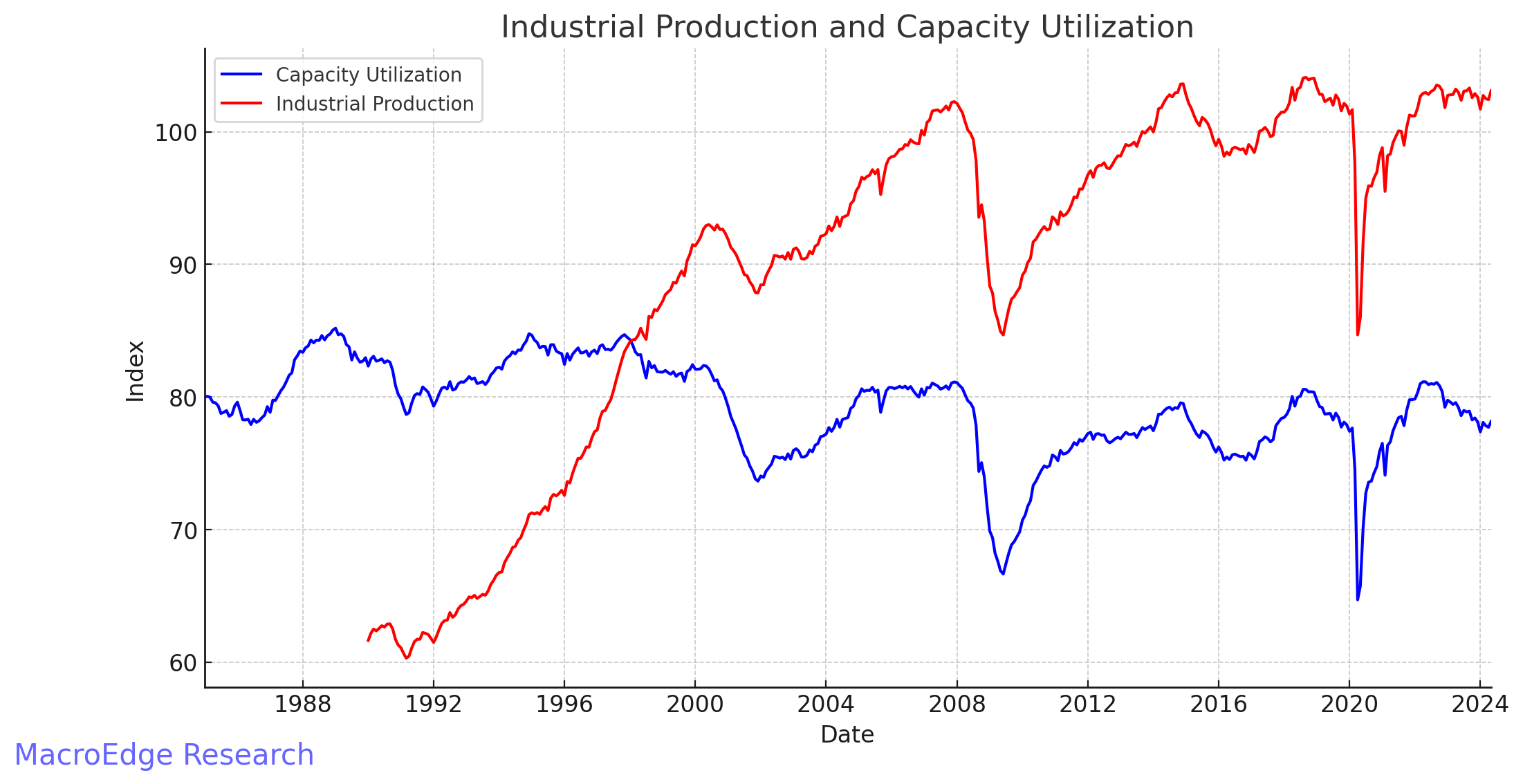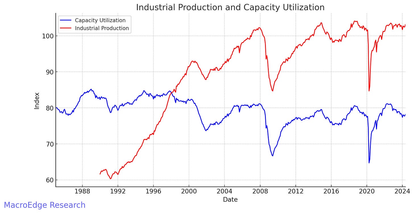 Manufacturing data in 1995 was strengthening rapidly - Industrial Production for this cycle peaked back in 2022, along with Capacity Utilization. The 90s saw large growth in INDPRO (industrial production) while we’ve seen virtually none since 2007 now.