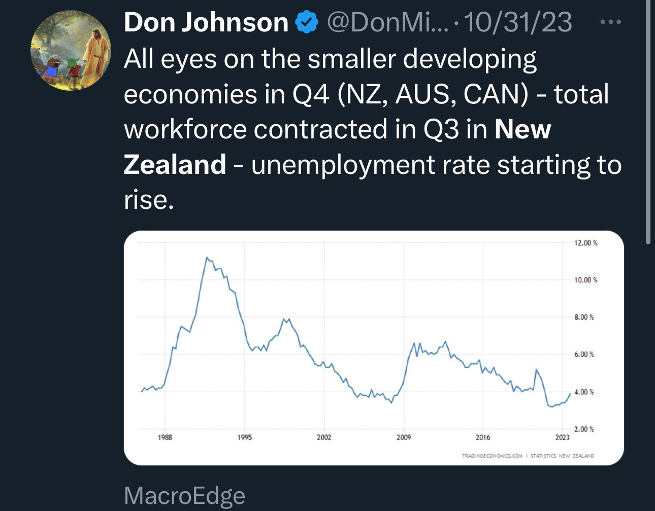 Concerning labor market trends in Canada and New Zealand need to be followed closely - as they may point towards a broader global labor market slowdown as policy starts to go in the other direction around the world. Remember that the policy transmission lag is slow and long for rate hikes, and employment is the slowest element of central bank policy: