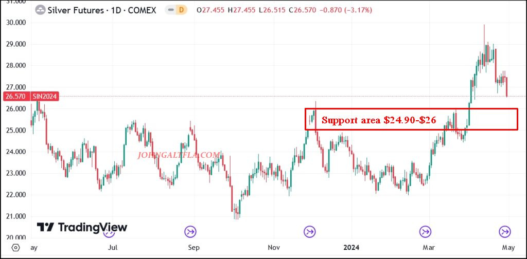 Revisiting the short term support between $24.90-$26.00 seems likely as gold and copper drop in the weeks ahead, but odds are geopolitical events will drag the entire complex higher.