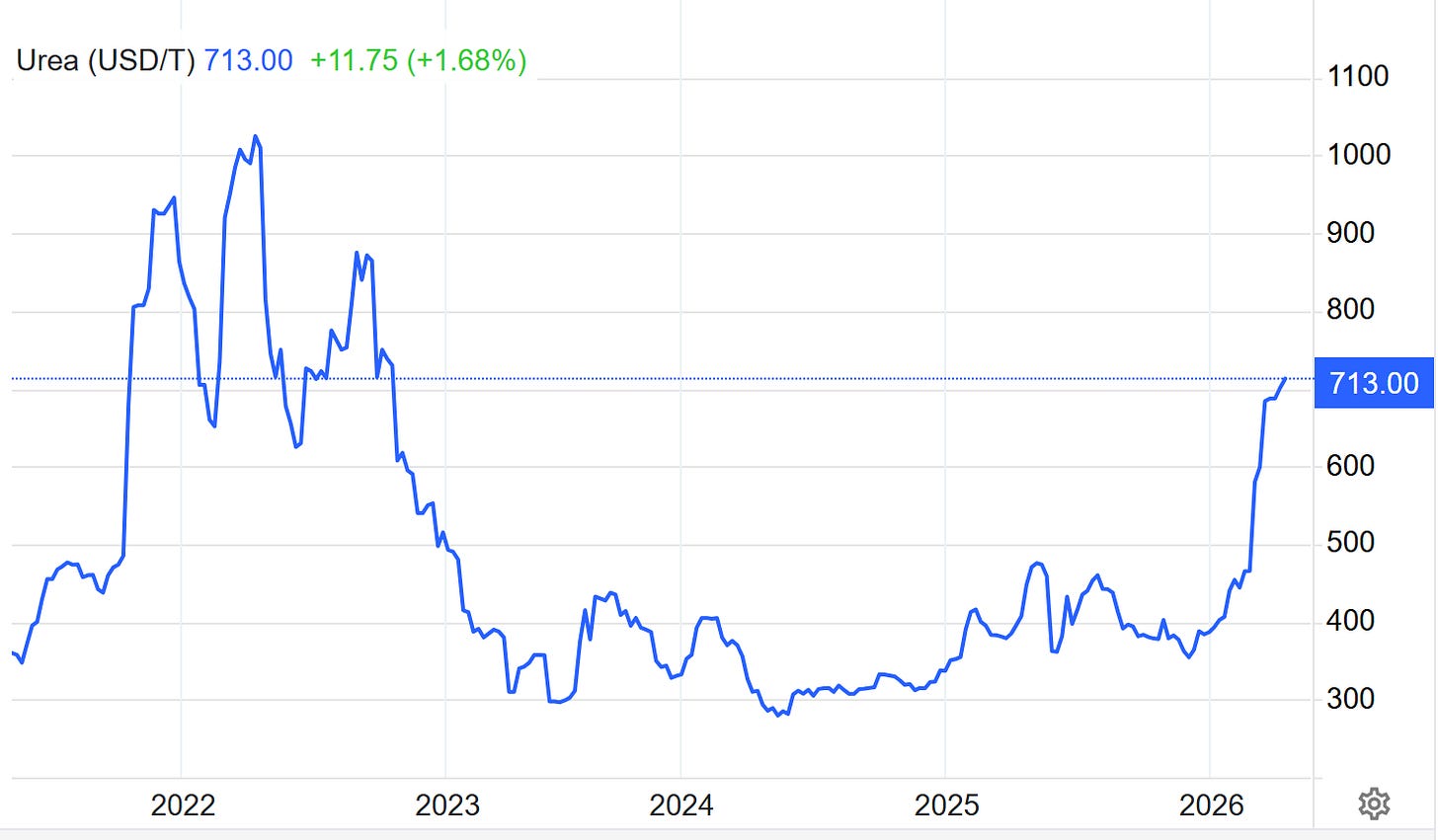 It’s been unbelievable to watch the collective delusion around the Strait of Hormuz closure and the impacts the situation is already having on the world economy. This is a pandemic-sized shock in terms of impact, with oil demand needing to go the same way that we saw from the pandemic to eventually get prices restored. With physical barrels hitting as high as $268/bbl in countries like Sri Lanka - and jet fuel pushing $198/bbl global average - these are at all-time high levels… but the question I am getting asked frequently in both calls and on X is whether or not this will reflect into the futures market, I undoubtedly think it will, barring any immediate economic shock. By pumping equity markets back to the highs, and with the Fed unleashing balance sheet expansion now as commodities rip, that will not sour demand in developing nations, and thus prices will have to go higher toward demand destruction levels in order for the market to find equilibrium. Here’s Urea prices as one example of this mounting commodity shock that is still one of the most obvious, given the fact that the Strait of Hormuz remains effectively closed, and the 13mpbd of oil supply remains offline from the market: