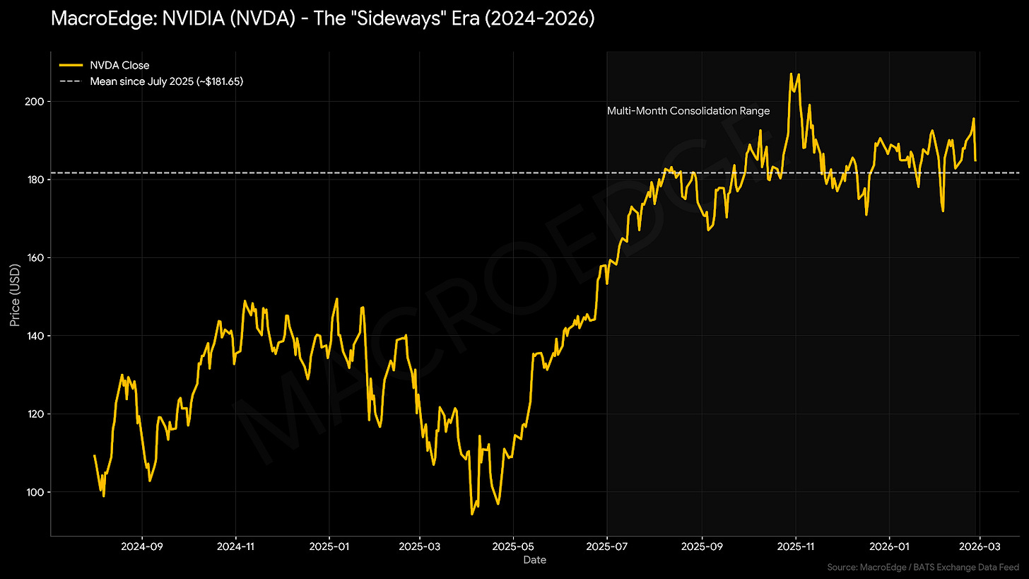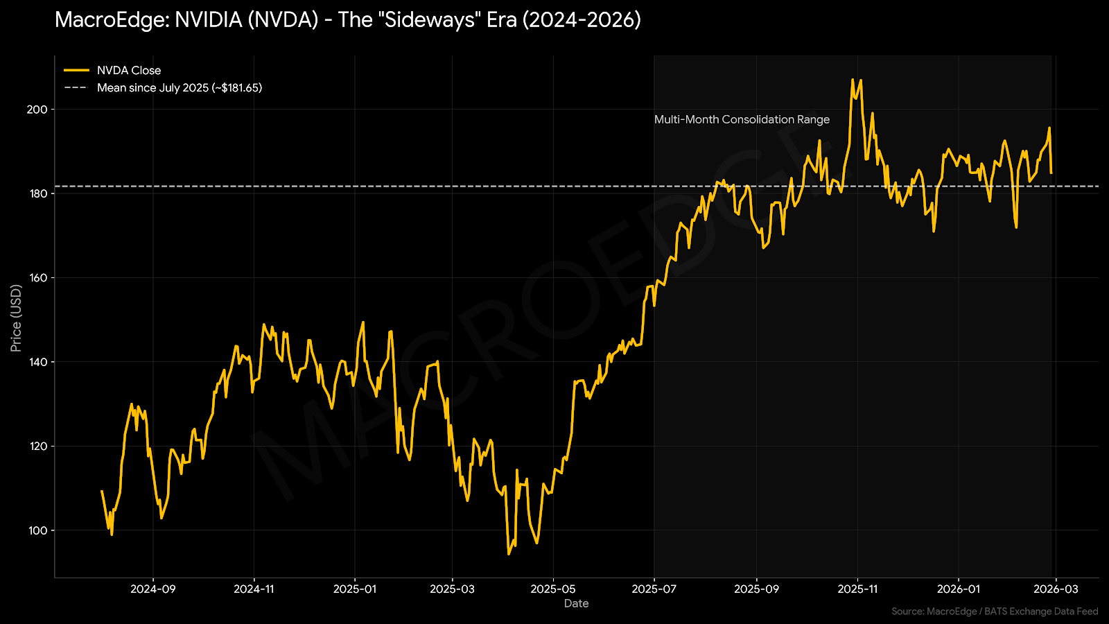 Behind the record-breaking numbers, a thicket of structural risks is beginning to weigh on the “AI and hardware” narrative. The outlook for data centers is increasingly wobbly due to physical constraints that even Nvidia’s software can’t solve: a mounting energy crisis where power availability has replaced chip supply as the primary bottleneck. Furthermore, nearly 50% of revenue still originates from a handful of hyperscalers (Microsoft, Meta, etc.), leading to growing “circularity” concerns. Investors are questioning the ROI for these customers as their capital expenditures (CapEx) balloon toward a collective $700 billion. This fundamental tension is reflected in the technicals: Nvidia has been essentially sideways since July 2025, churning in a volatile range between $170 and $210. This eight-month consolidation suggests the market is no longer pricing in just “potential,” but is waiting for proof that the massive infrastructure spend will translate into sustainable corporate profits beyond the semiconductor sector… which I continue to believe is unlikely.