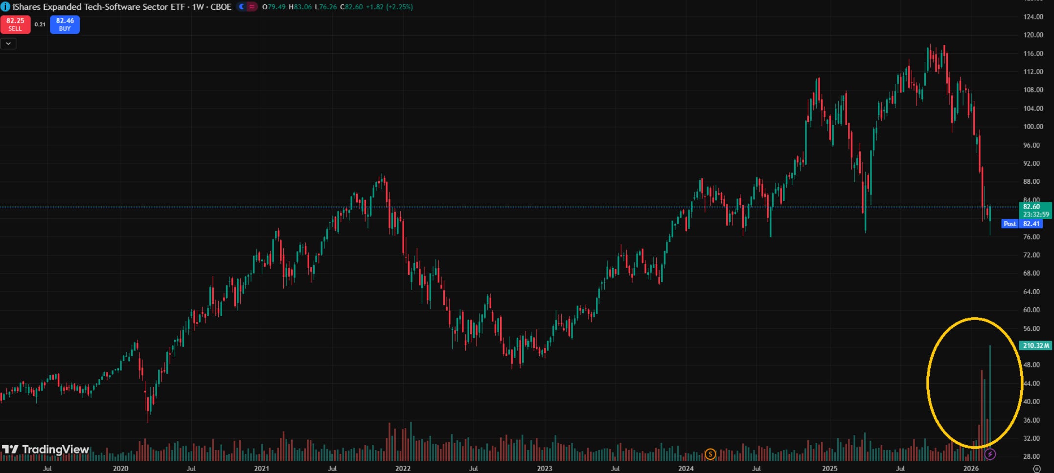 Software volume is exploding higher. Using IGV software ETF as a proxy, we can see enormous capitulation-style selling price action the last couple of weeks, with enormous up volume this week, as the dip is bought. This is exactly the type of action you see at climatic reversals.