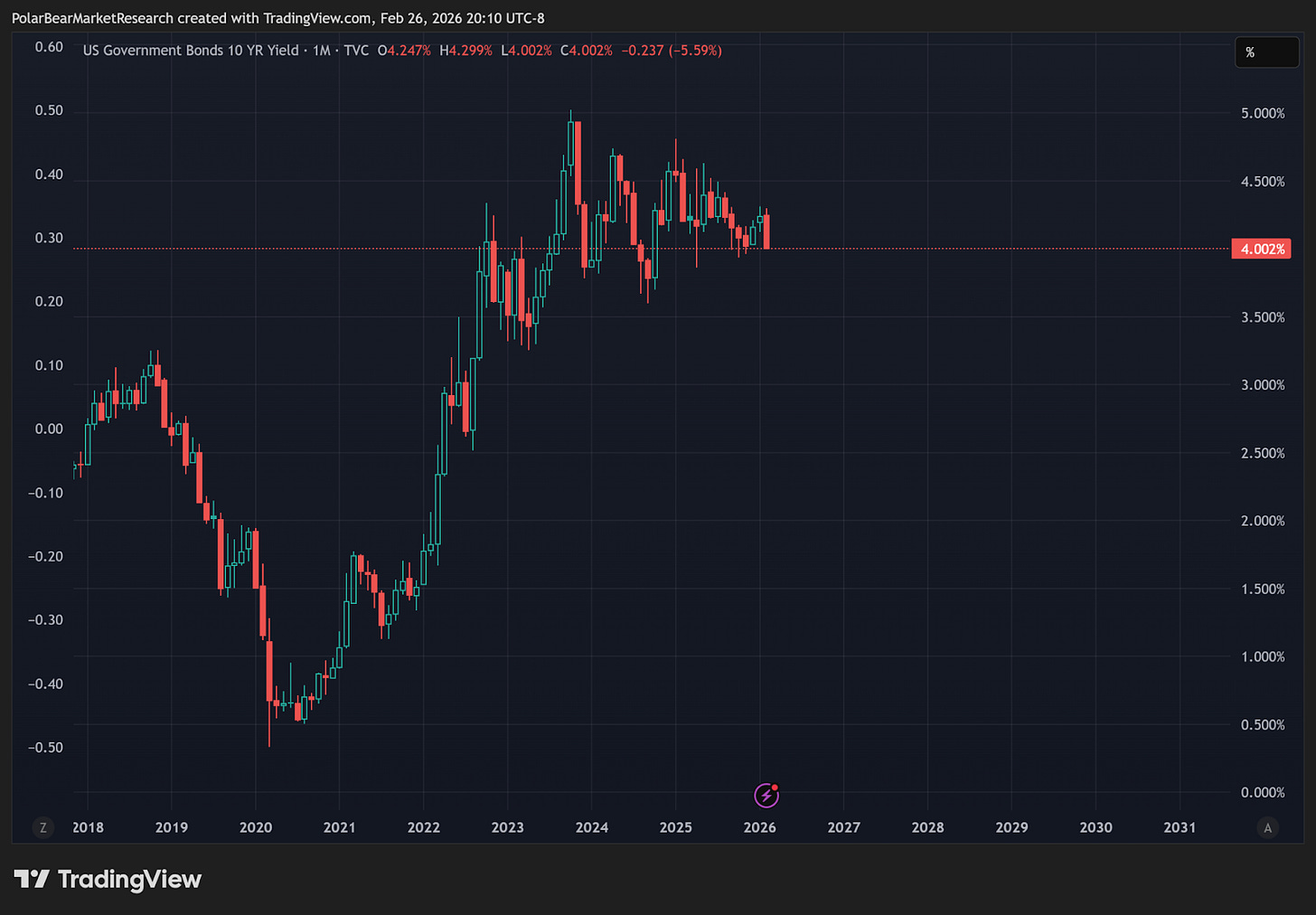There are plenty of catalysts for why prices could start to move higher here, and we can also acknowledge that the Administration in a midterm year is going to fight as hard as they possibly can to keep a lid on WTI right around this level, especially as inflation base effects wear off. The 10Y has dropped, move oppositely of oil for the time being, and is set to tick below 4% again: