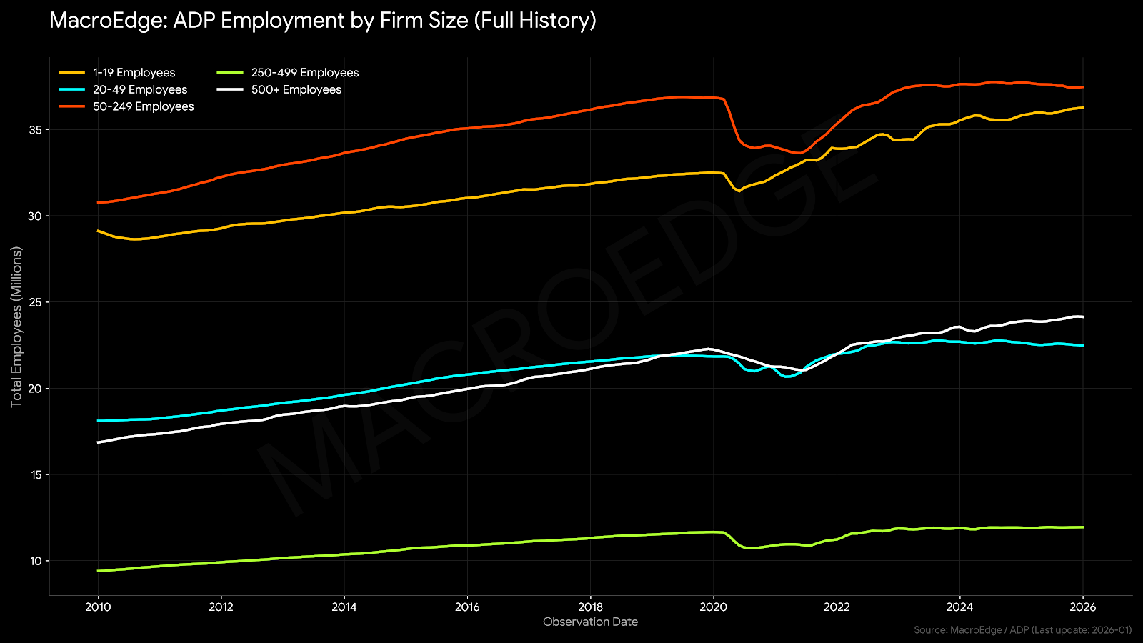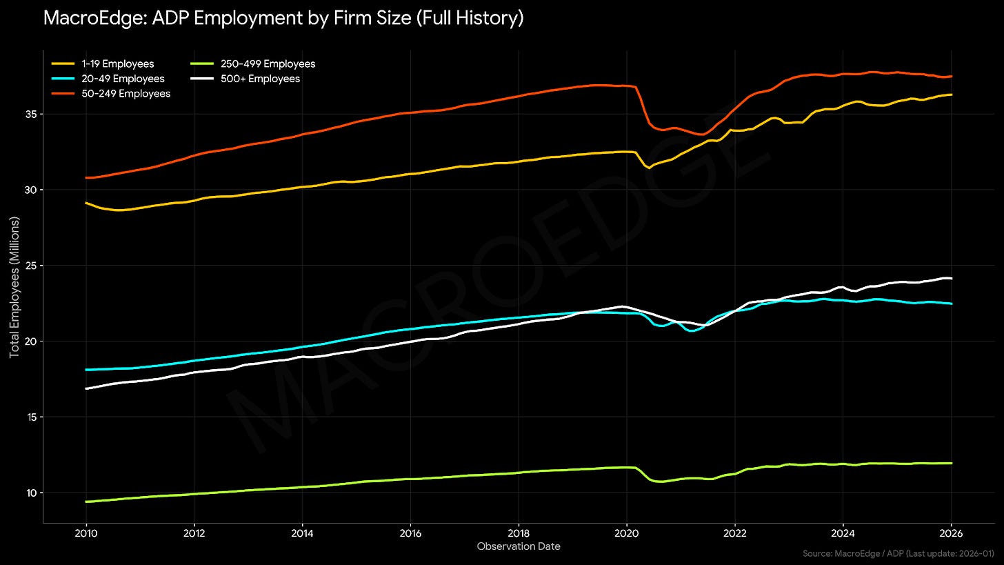 ADP weekly job data has improved a bit, with the monthly run rate (4WK MA) back at about 40K. Small business employment continues to lag, which is part of the ‘i-shaped’ economic dynamic we’ve seen over the past 18 months. All employment growth is currently coming from the smallest firms (1-19) segment, ie, self-employed individuals, and what I expect is likely AI firms and other small technology firms. On top of that, the 500+ category continues to expand, since they are able to shoulder the higher burden of high healthcare and labor costs, as well as take advantage of things like visa-based employment.