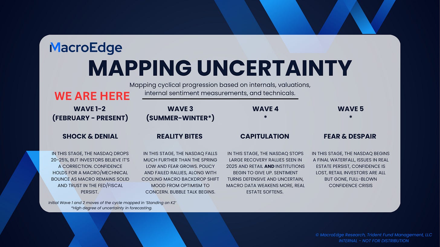 We’ve already temporarily downshifted out of the shock & denial stage - and people ate up the fiscal put today from Trump / Bessent - which is why we saw the reaction that we did. Similarly to other major market tops and weekly breakdowns historically, we see sharp reactions like the one we saw today as investors attempt to claw back their ‘up only’ glory days of the blowoff rally. I encourage readers to pay close attention to past failed rallies that result in second major lower highs as I expect we are on course for. The reason I expect that is that Trump is lacking the support of the Fed today - unlike in his 2018-2019 days where he was able to successfully jawbone Powell into reducing rates to near zero to get economic activity moving again. That’s not to say that Powell and Bessent aren’t discussing, or even collaborating on their policy moves, but the Trump impulse for breaking the Fed’s back isn’t as powerful as it was (at least thus far) in his 1st term. If the Fed does pivot to a more supportive stance - it’s important to leave open a more 2018-style scenario - even though the valuation and internal backdrop is starkly different. As we progress into late Spring - we’ll begin to reflect changes in the above uncertainity map - it’s rarely the impulse 1 & 2 move that gets investors offsides enough to stop shoveling money into the third most expensive market on record, by our measures. One thing I do want to happen is a quieting down of the ‘retail bear’ crowd that seems to still be especially loud - this happens as things settle down and we get lower (than 35) on the VIX)