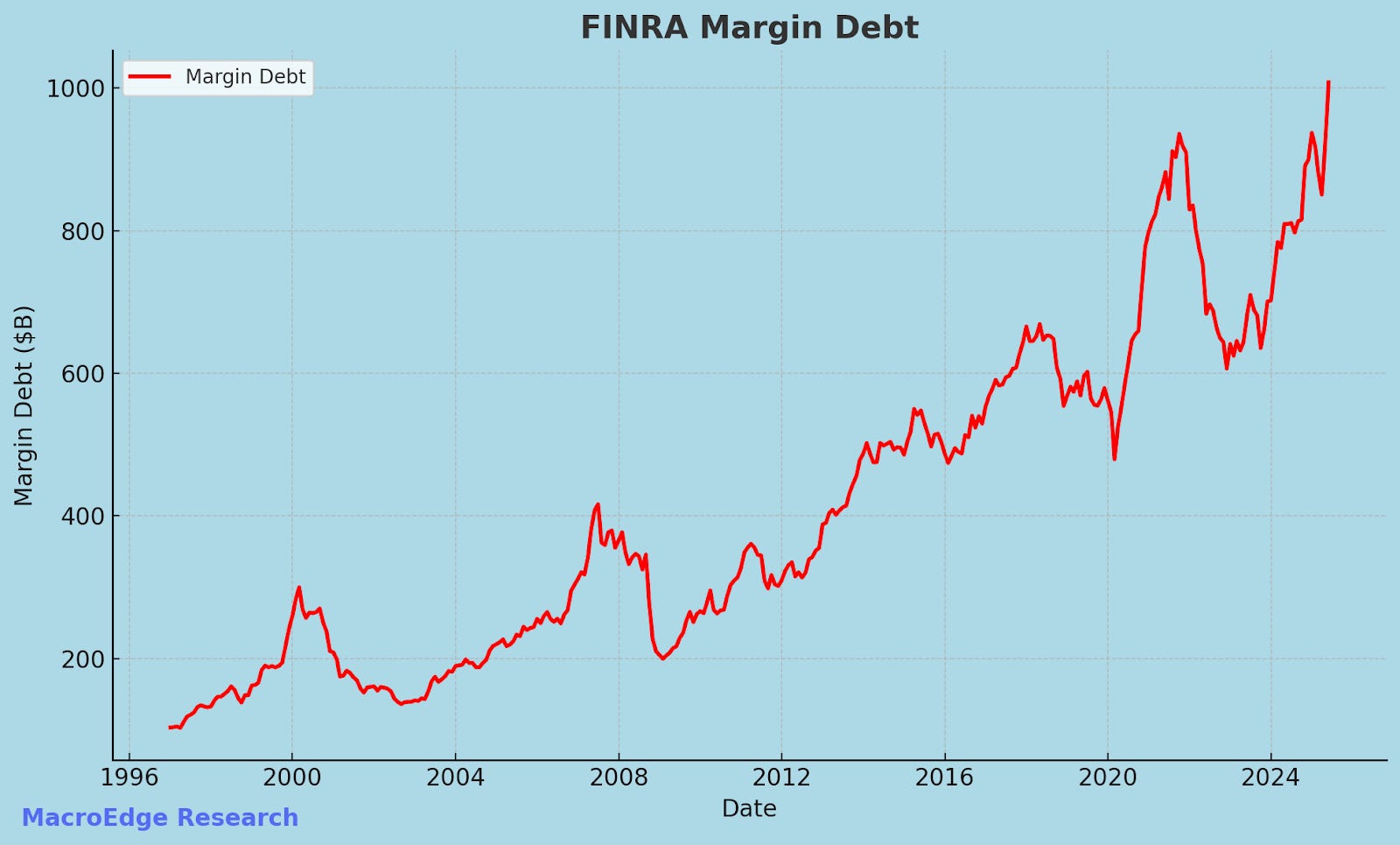 Margin debt in June topped $1 trillion across investing accounts, and the July print will likely see this figure jump another $50 or so billion based on the trend: