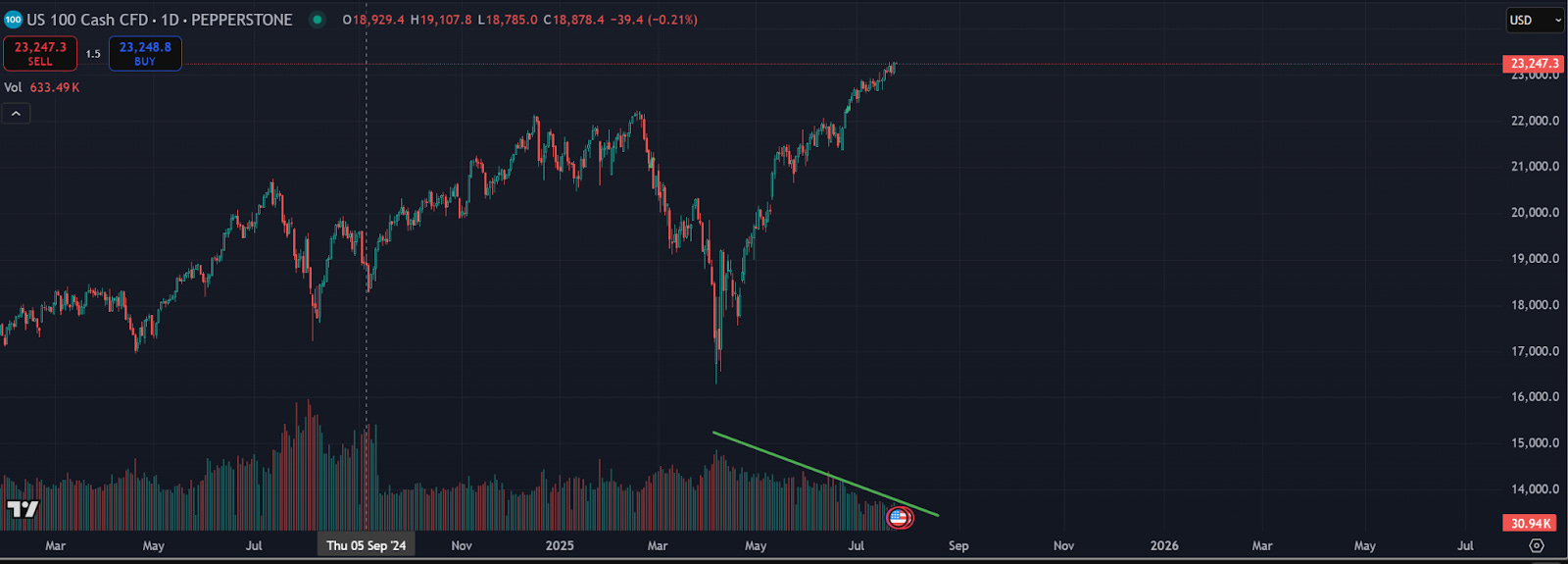 The President is set to visit the Federal Reserve today in a symbolic statement of opposition to the $2.5 billion scheduled renovations on the Fed building. That visit comes one week before the Fed is set to hold rates for another two‑month period. The hold means the next decision will arrive in September, and markets are leaning toward a 25 basis‑point cut depending on lagged tariff impacts, yields, and employment conditions between now and then. A cut right now is unjustifiable, given that financial conditions are near post‑pandemic levels after the Fed and Congress supplied unlimited dollars to the economy. If M2 equals inflation, these loose financial conditions will prove problematic at some point, but there is no clear pivot signal yet as negative divergence signals and declining volume and liquidity at these levels become more obvious.