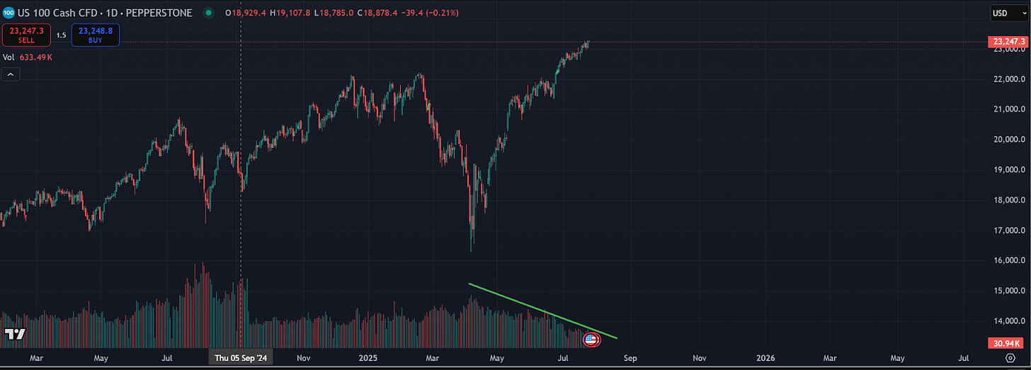 Since the April put on markets as bonds held on for dear life, we’ve seen a rally larger than both price action seen in 98 and post-2020 (so very impressive to say the least). When Central Banks stepped in globally to intervene in markets, and tariffs were paused, it gave the all clear to investors in an unprecedented risk on move that has spread across global equity markets (in places like Japan & China) and even more so in the high-beta assets like crypto, which has also enjoyed large moves over the previous 3 months.