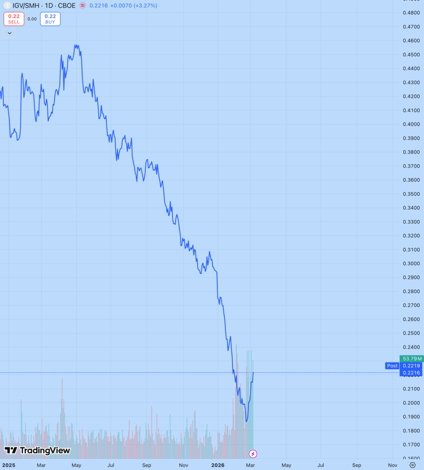 The market is flush with opportunity. The recent volatility spikes globally have caused substantial degrossing, and one of the most popular hedge fund trades over the last year has begun to unwind. This is the most substantial outperformance of software over semiconductors on a percentage basis that I can find on record in such a narrow stretch of time.