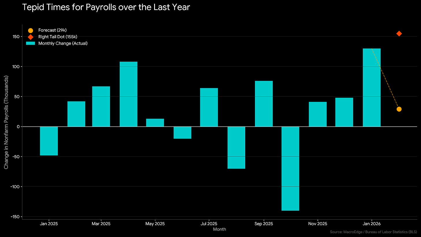 A hot print tomorrow is a slight right tail risk for yields and energy tomorrow, and given the issues with data quality, I actually foresee it as being probable. Below (the right tail risk - orange) and our forecast (yellow dot):