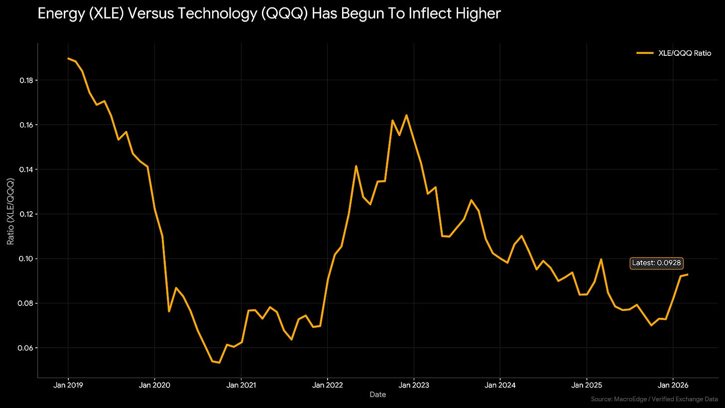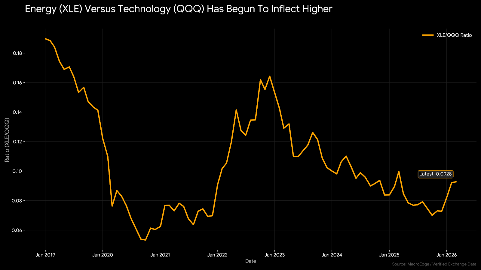 Today, we saw the first moment of public fear from the Administration over the spike in oil prices. Higher oil and gasoline prices are already hitting consumers, with the average consumer seeing an increase of gasoline prices of about 60 cents just this week. As highlighted a few weeks back, the energy (XLE) versus QQQ ratio has continued to inflect higher: