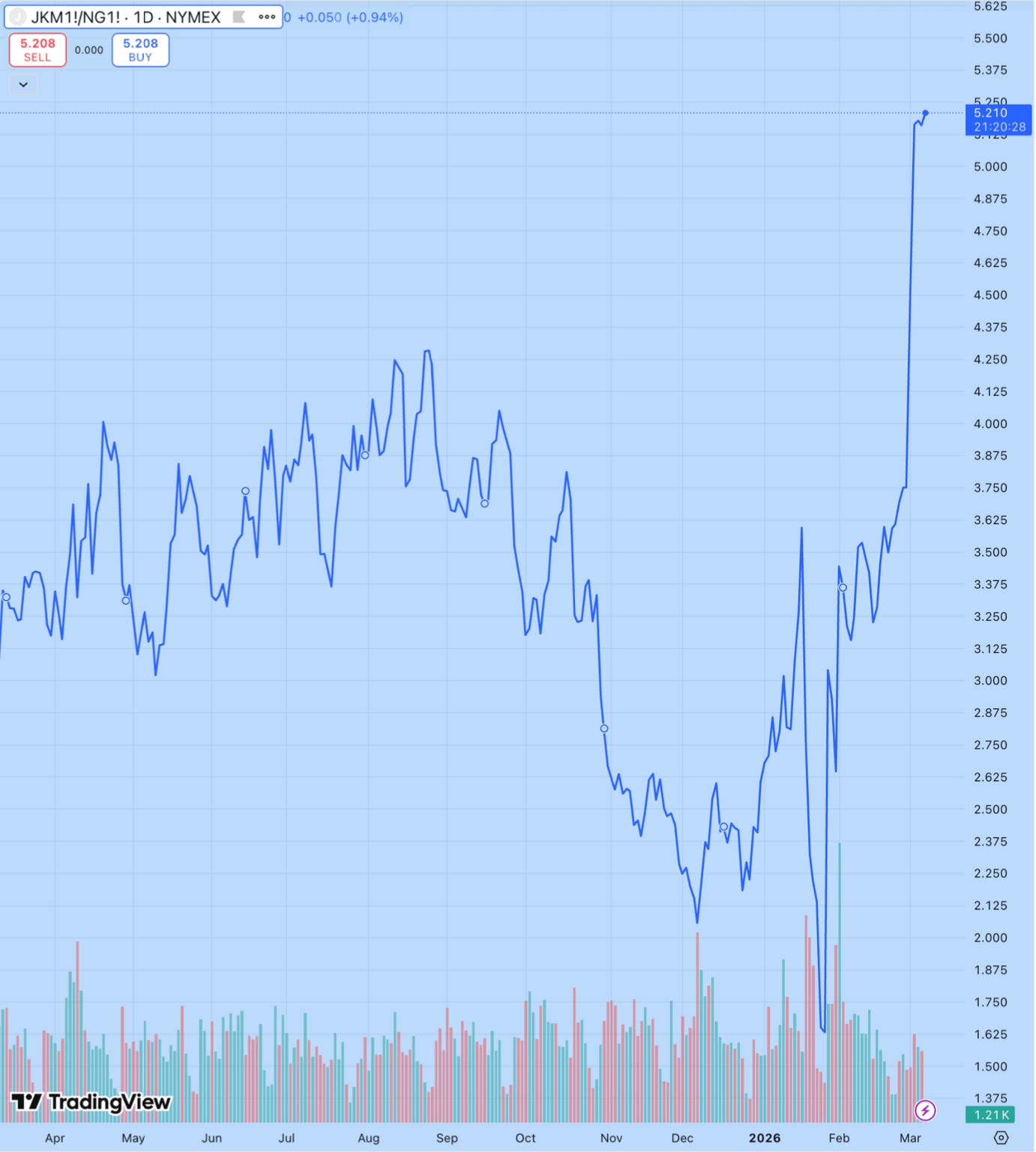 It’s not just oil; the energy shock has hit the natural gas sector. QatarEnergy has officially declared Force Majeure on several LNG cargoes destined for the UK and South Korea. Because the Strait of Hormuz is the only exit for Qatari LNG, the global gas market is facing its most significant supply disruption since the 2022 Nord Stream crisis. JKM (Asian gas) prices have jumped 15% today in response.