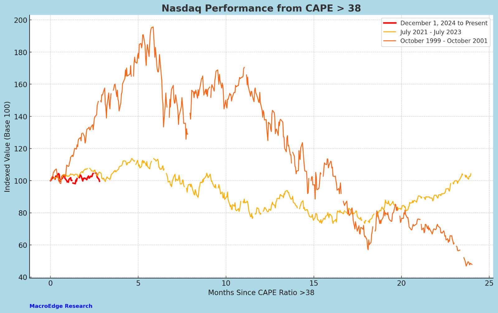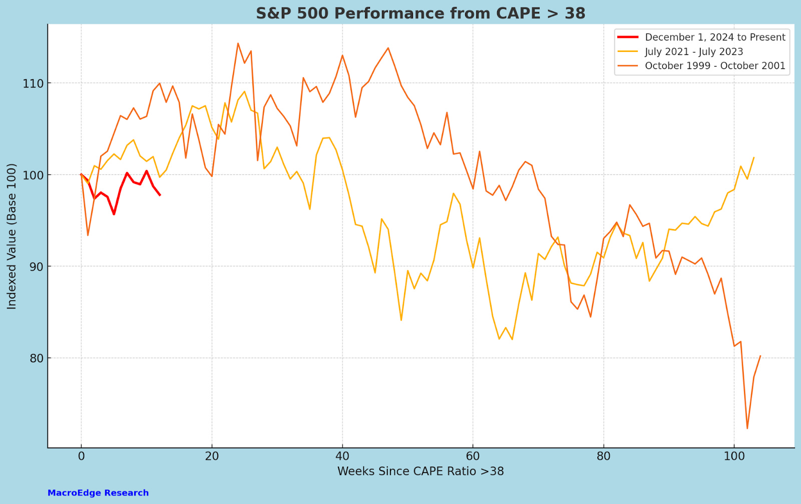 While modern valuations may live at a higher baseline for a variety of factors, a CAPE above 38 has never seen a positive 2-year return, and remains pressured at 1-year, even though there’s only one instance where a positive return was seen 12 months from CAPE > 38, which was late 2001.