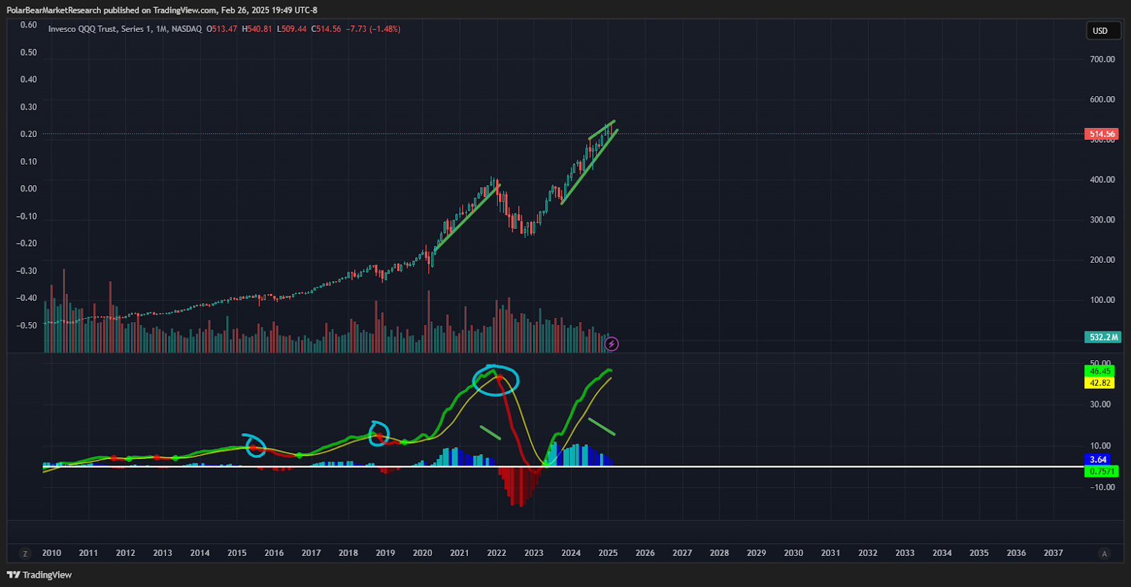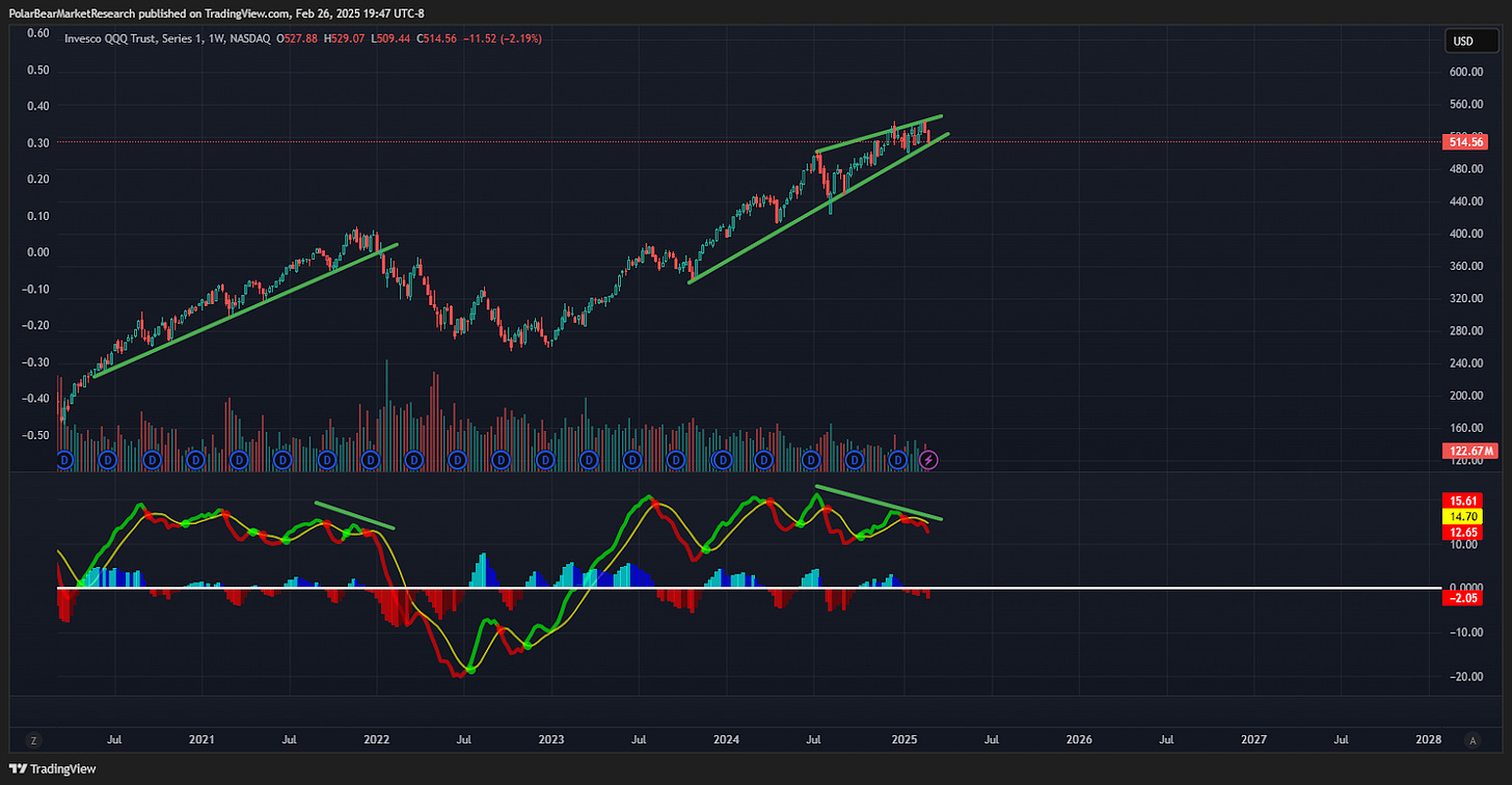 My technical outlook is showing a market weakening on the longer-term timeframes, which isn’t a bullish signal. For the Nasdaq (QQQ shown below), the trend is still intact, however: