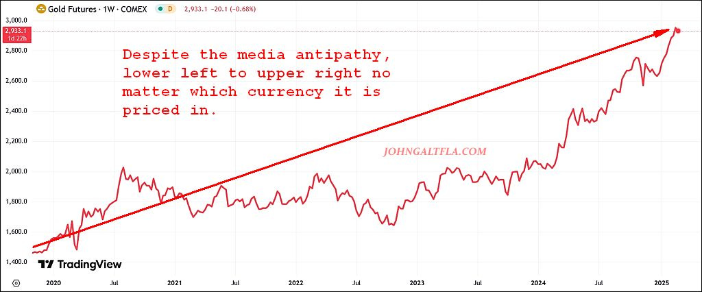Regardless of this, the mainstream media continues to push the narrative that gold ownership is for eccentrics, kooks, survivalists, or doomers who live in lead clad homes with five years of survival food stored for when eggs are poisoned by the New World Order.