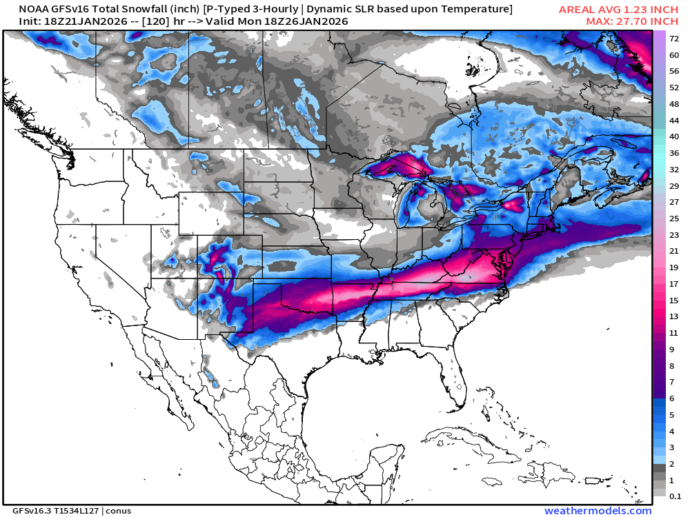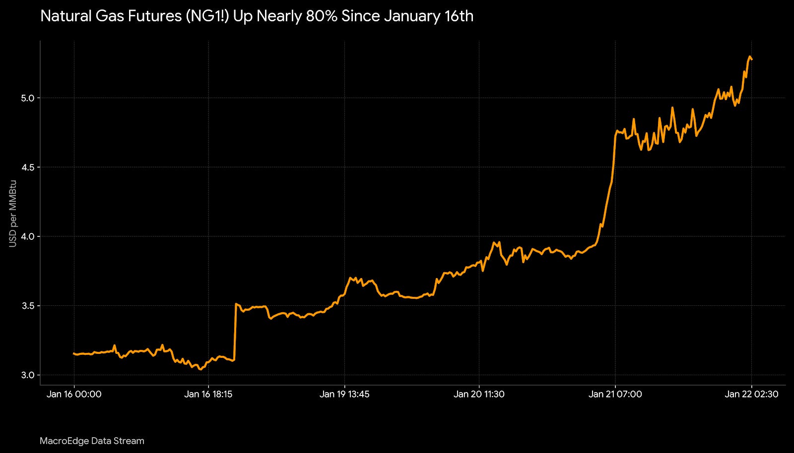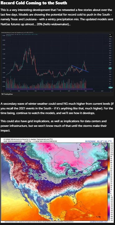 On Monday evening, in the Weekly Macro Note, we highlighted the possibility of a tremendous surge in natural gas due to historical storms lining up the weather data modeling. While I source this data externally, following the right people in the space is very useful for determining what’s actually going to occur. Last Friday, it became apparent that modeling was pointing towards a smashing cold front that would push deep into the South & SE USA. That’s now en route, and I am luckily making my way out of the South in the morning & over to Albuquerque first thing.