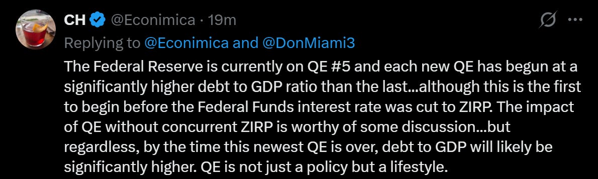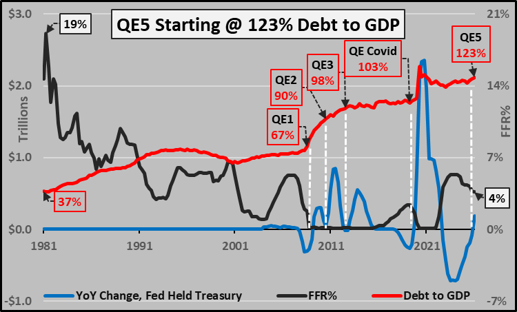 We are starting the warm-up to QE-5 at almost 123% GDP, a terrifying fact for those of us who understand the long-term implications of this policy (in things like birthrate collapse):