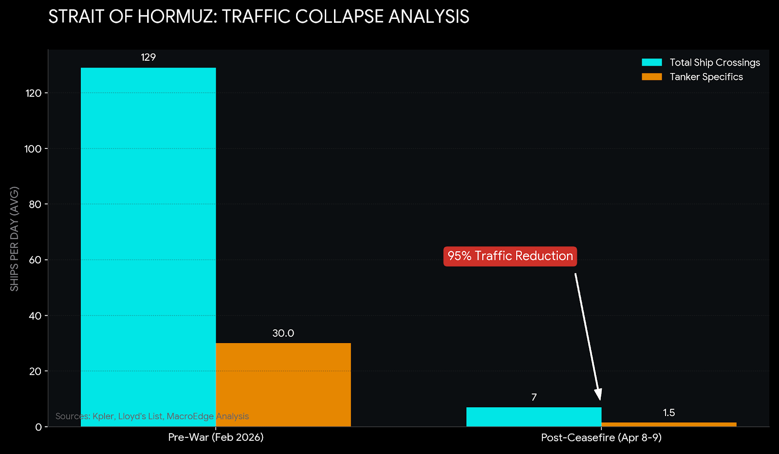 Near-Zero Tanker Traffic: Since the ceasefire took effect, only 3 non-Iranian oil and chemical tankers have successfully crossed the Strait as of late April 9. This is a large drop from the pre-war average of over 120 daily crossings.