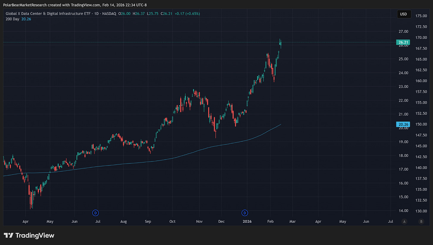 As discussed in several reports over the past 45 days, this pattern looks a lot more distributive (ie: Dotcom and 2022) than a constructive pattern building a base to move higher. I think that’s something to stay aware of in the coming months as things like broader data center opposition move their way into the spotlight. For the time being, the data center sector itself, and the AI (AIS) basket have remained near all-time highs - though I expect these to flag some wounded-bird syndromes in the near future as investor concerns catch on to what is the craziest investor hype of our lifetimes, largely into something that generates no ROI for firms.