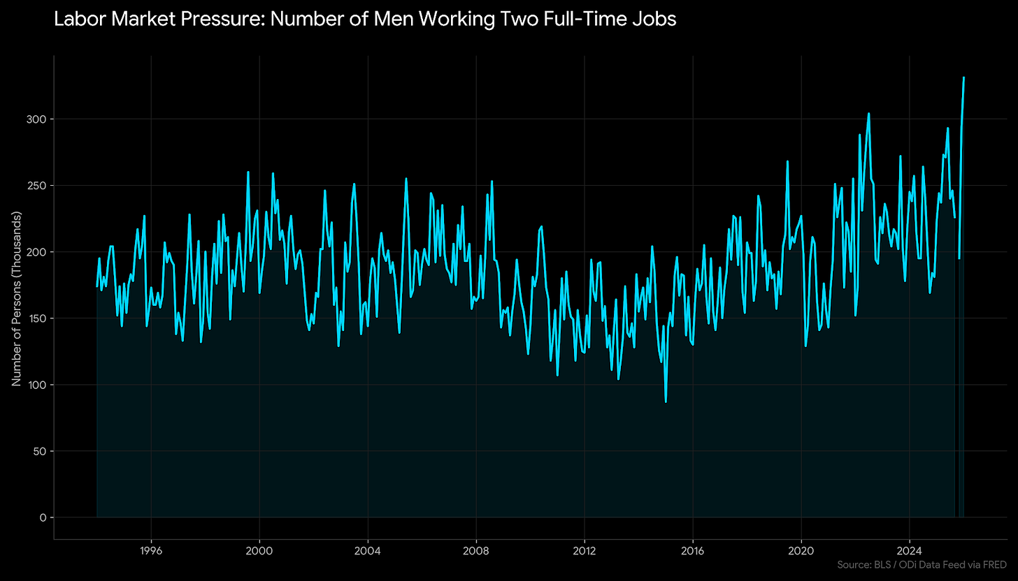 A viral chart I posted from the employment report - the number of two full-time jobholders (at least the ones that are reported) printed its second highest level on record - while the number of men working two full-time jobs hit a new high… for a perceived ‘golden age/era’ much of this is not trickling down in the lower 90% of the i in this new economic era.