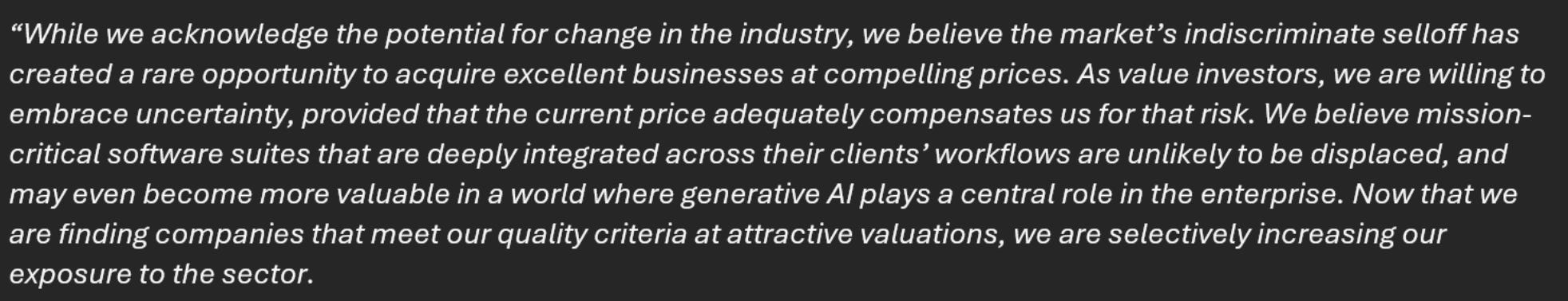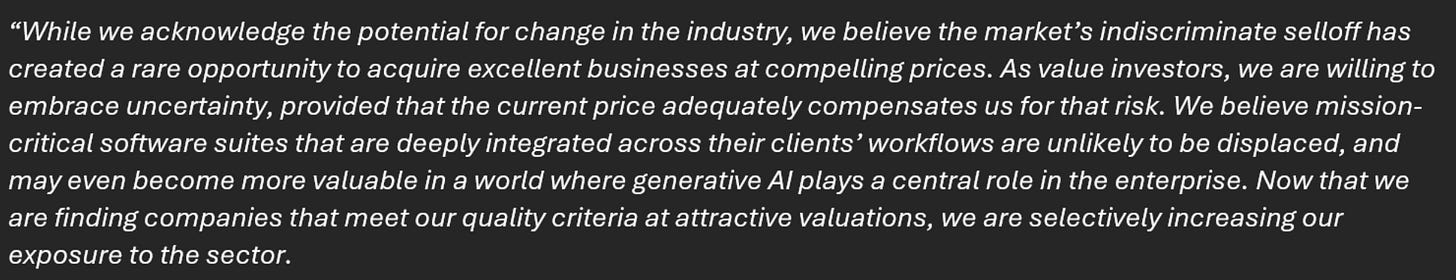 The market is increasingly shooting first and asking questions later as it comes to AI disruption risk. Some, perhaps fairly, others quite unfairly. While I do not want to catch a falling knife in a sector that historically has a high beta to SPX in a market regime where I broadly have a somewhat negative view on equity beta, I do see value in accumulating software positions with a longer-term view. Below is the view of the Oakmark fund’s portfolio manager on software. This fund has outperformed SPX since inception, and remains my favorite value manager.