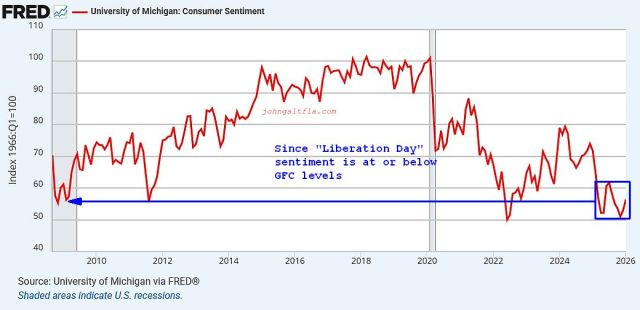 Perhaps all of these hits to the consumer have been too much leading into Christmas of 2025 and that’s what is keeping consumer sentiment in the proverbial doldrums. From today’s release of the University of Michigan consumer survey: