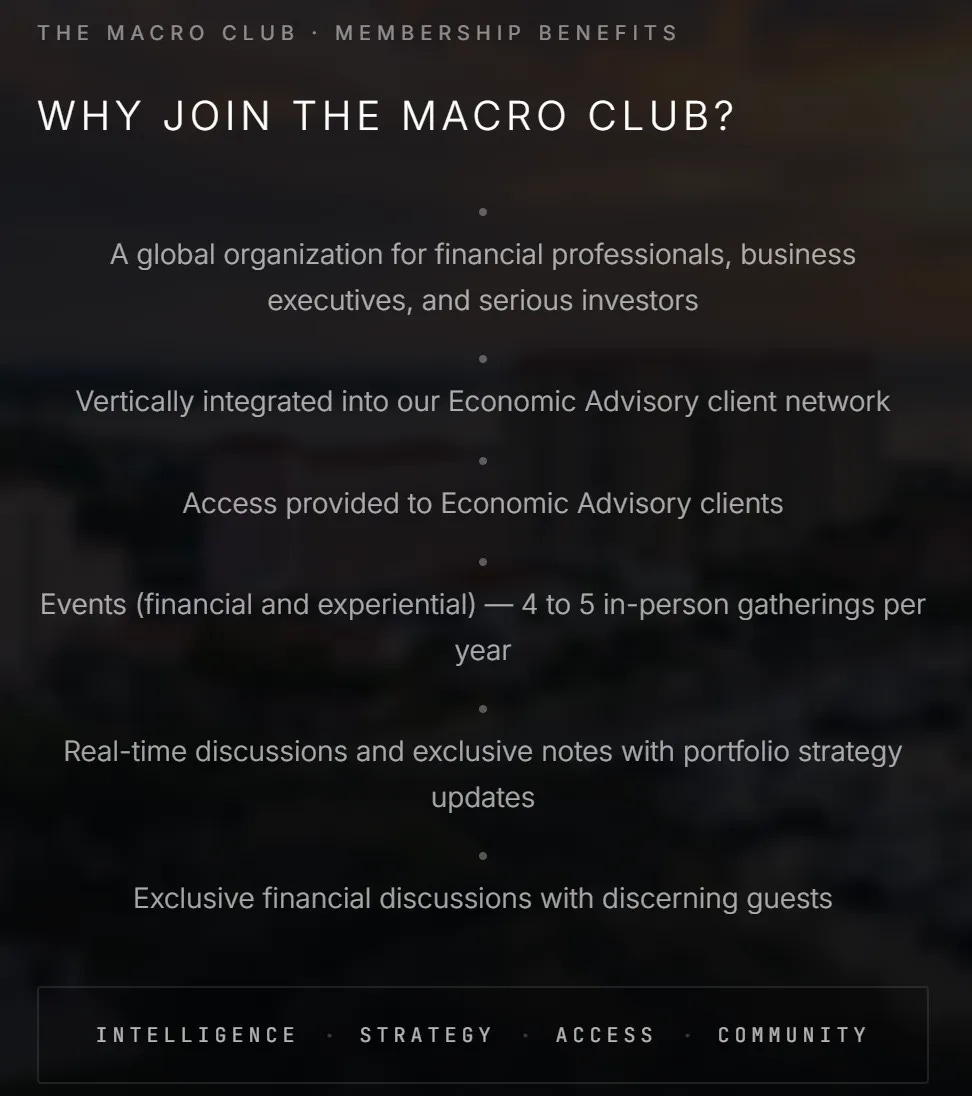 The Macro Club will serve as our private community for serious investors, money managers, and financial professionals, financial authors on platforms like Substack, and business executives.