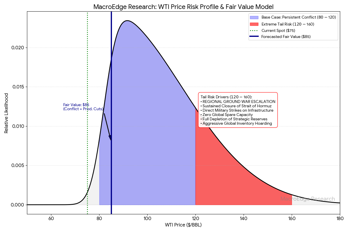The right tail for oil is much higher, and I currently have a fair value (with no change in market conditions) in the mid-80s (baseline), on the right-tail scenario, this would land WTI between 120-160, likely for a very short period of time, as the impact would likely have a significant negative impact on the economy… remember the spike in 08?