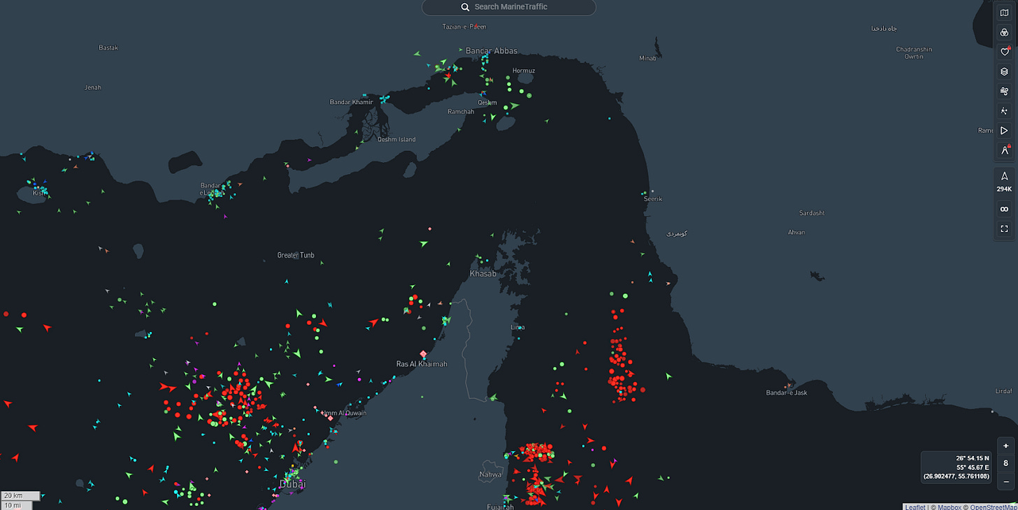 Oil traffic through the Strait dropped to the effective zero bound today, which is a positive tailwind for prices.