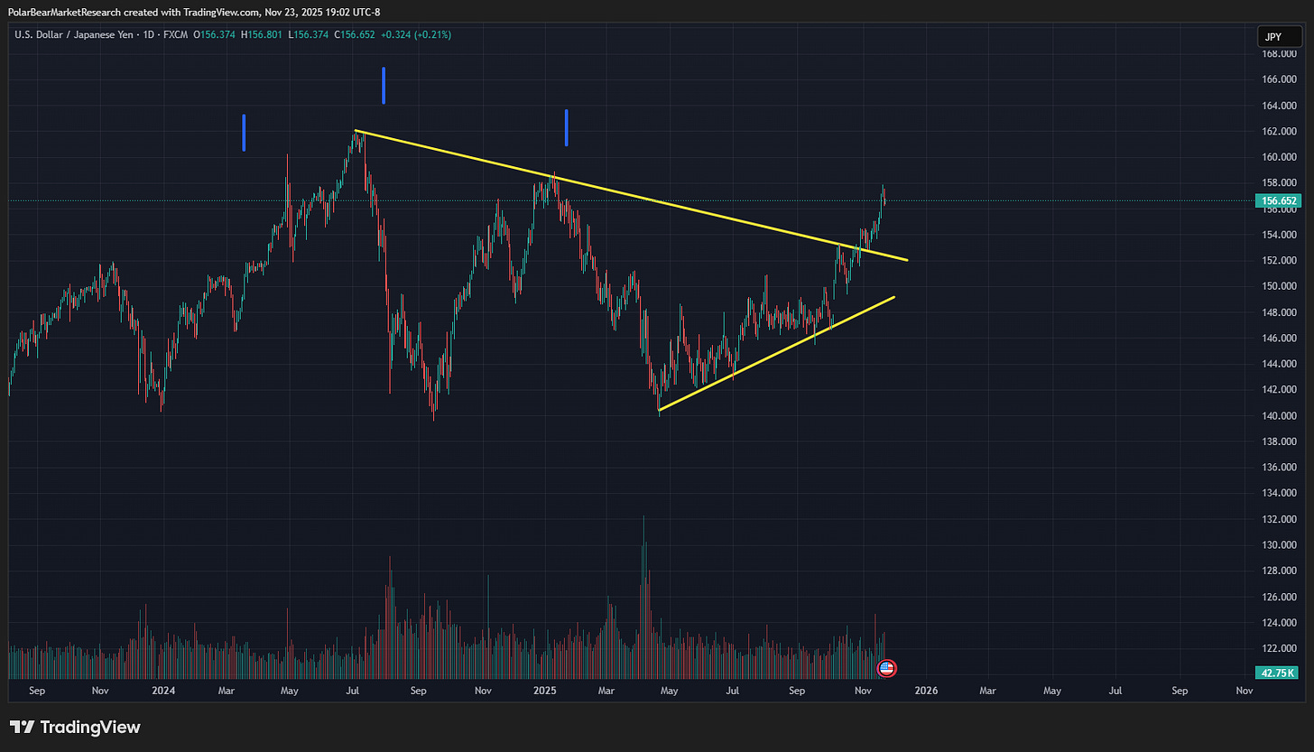 This week will likely be quite light on volume (given both the full day off Thursday and the half-day on Friday), and the real traders & houses have already left their cities for the first ski trip of the season in Jackson, or down to Florida, Mexico, or the Caribbean to seek Turkey under warmer conditions. So far, we’re off to a pretty tepid start to the week with ES up about .25%, Bitcoin up a little more at about $87.5 (2.5%), and the NQ up about .45%. Given the wind-down in earnings as we highlighted last night, and a general lack of data this week, really until post-FOMC next month now, it’s more of a monitor the markets & Japan pattern now as we shift from November into December mode. As we head into winter, action should pick back up, though I expect more tepid conditions through both holiday weeks themselves. As highlighted below in the portfolio strategy updates section, I am beginning to look for an attractive entry zone on several names, and we will publish those updates out as they are made, intraday or in one of the Midweek Macro Notes.