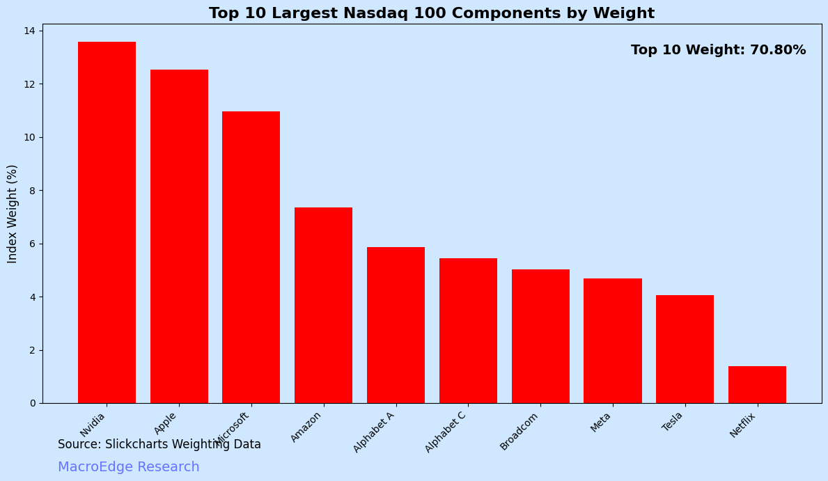 Concentration risk is as high as it has been - and the passive effect (covered by Michael Green) plays an extensive role in this feedback loop. For the S&P, it’s less but still very elevated by historical standards, with the top 10 names making up about a 40% weighting.
