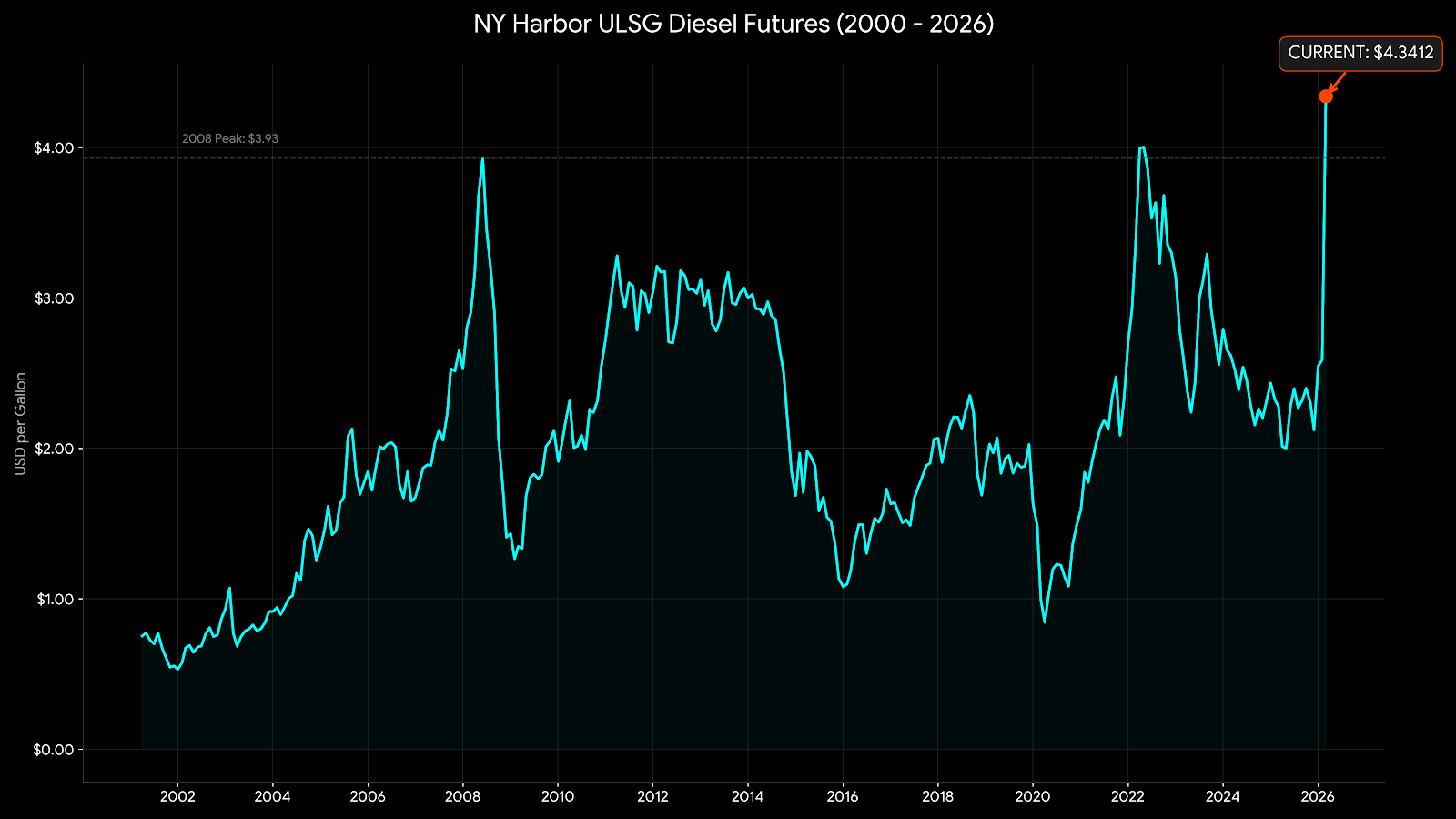 Supply Chain Collapse & Food Hyper-Inflation: Diesel is the “blood” of the global supply chain; it powers the cargo ships, freight trains, and semi-trucks that move 90% of global goods. If ULSG Diesel remains above $4.30/gal (Futures), transport surcharges will be passed directly to the consumer. More critically, high energy prices increase the cost of natural gas-based fertilizers. This creates a “double-squeeze” on food: it becomes significantly more expensive to grow, and even more expensive to move, leading to rapid price hikes at the grocery shelf.