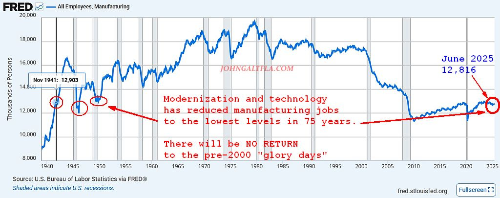 Even though new manufacturing techniques have improved, to see numbers like that is breathtaking. The sector has barely recovered from the outsourcing surge under President Obama and worse, is at levels unseen since just before World War II. Yikes indeed.