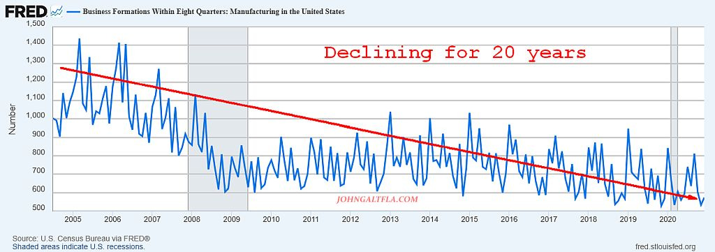 The data does not lie as manufacturing business creation has been in a 20 year decline but instead of analyzing why, the average American has followed the lead of team MAGA by blaming illegals and unfair trade practices.