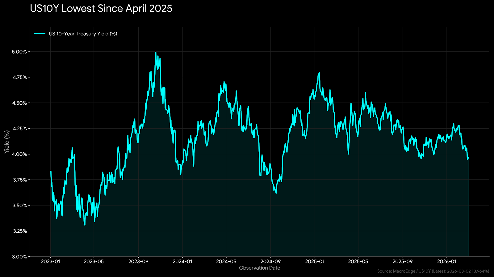 On the geopolitical front, things are staying very volatile for the time being. The situation in Iran and the Middle East is very fluid, and we’re monitoring shifts as they continue to come in. The primary focus this week on our end will be the impact to energy and tanker markets, respectively, and it’s also notable that bonds are catching a continued bid on the strikes. Futures have nearly erased their dip in technology equities (NQ), and at the time of this writing, WTI is up about 7%. These gaps usually quickly resolve in today’s markets - and the broader distributive charts are quite sticky right now from a range standpoint. The 10Y is also at its lowest level since April of last year: